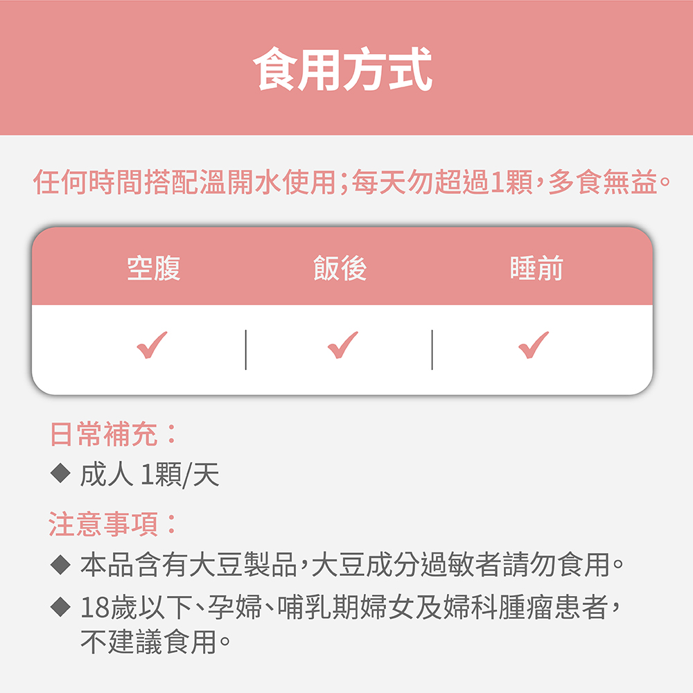 不建議18歲以下、孕婦、哺乳期婦女、婦科腫瘤患者或對豆類蛋白過敏者食用。使用荷爾蒙治療的婦女請先諮詢醫師建議後食用。