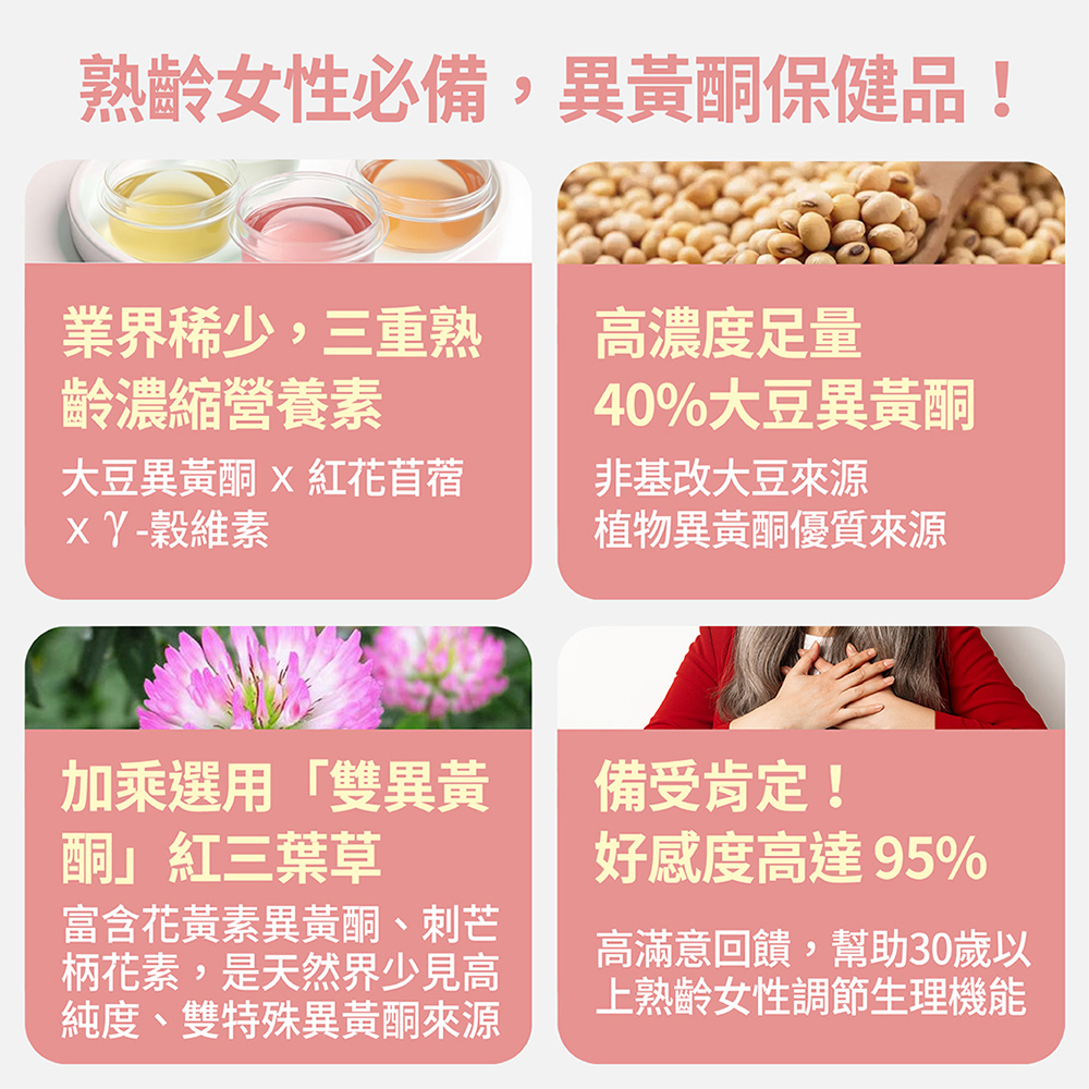 ➤ 每日1顆,任一時間食用➤ 非基改大豆+紅花苜蓿植萃來源➤ 含40%大豆異黃酮,多種植物性異黃酮素➤ 30歲以上熟齡女性生理調節➤ 調節生理機能,養顏美容➤ 高吸收率「去醣基」大豆異黃酮➤ 添加米糠精華 穀維素,幫助入睡➤ 營養補給健康維持➤ 幫助青春美麗
