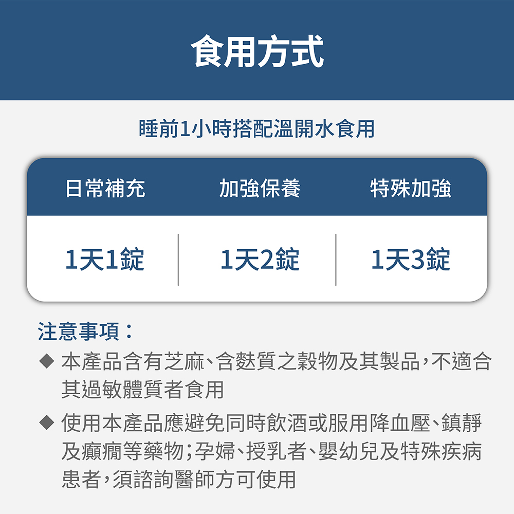 建議在睡前1小時食用,並搭配溫開水最好喔。一般日常1錠/天,加強2錠/天,若特殊需求需再加強可3錠/天。