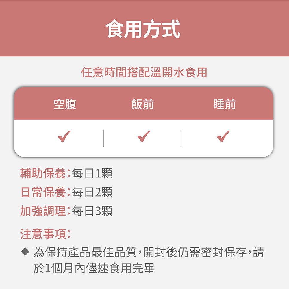 ➤每日1-3顆,任一時間搭配溫開水食用