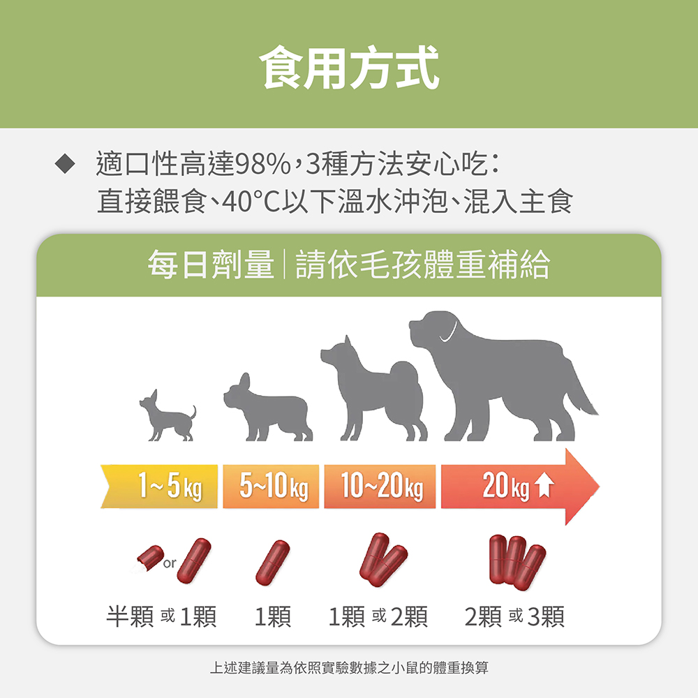 2.每日食用建議量:1-5公斤0.5-1顆,5-10公斤1顆,10-20公斤1-2顆,20公斤以上2-3顆。
