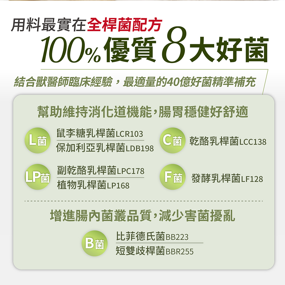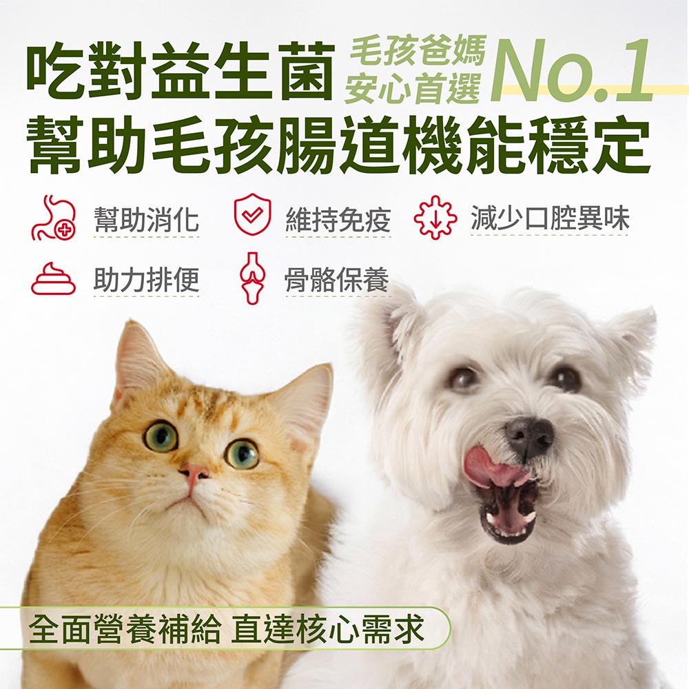 益生菌為營養保健食品,建議每天穩定持續補充,讓毛孩增進腸內菌叢品質,維持最佳狀態喔!