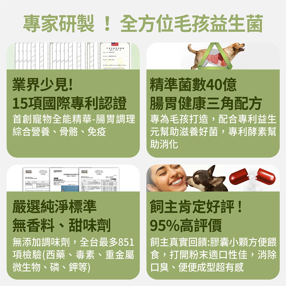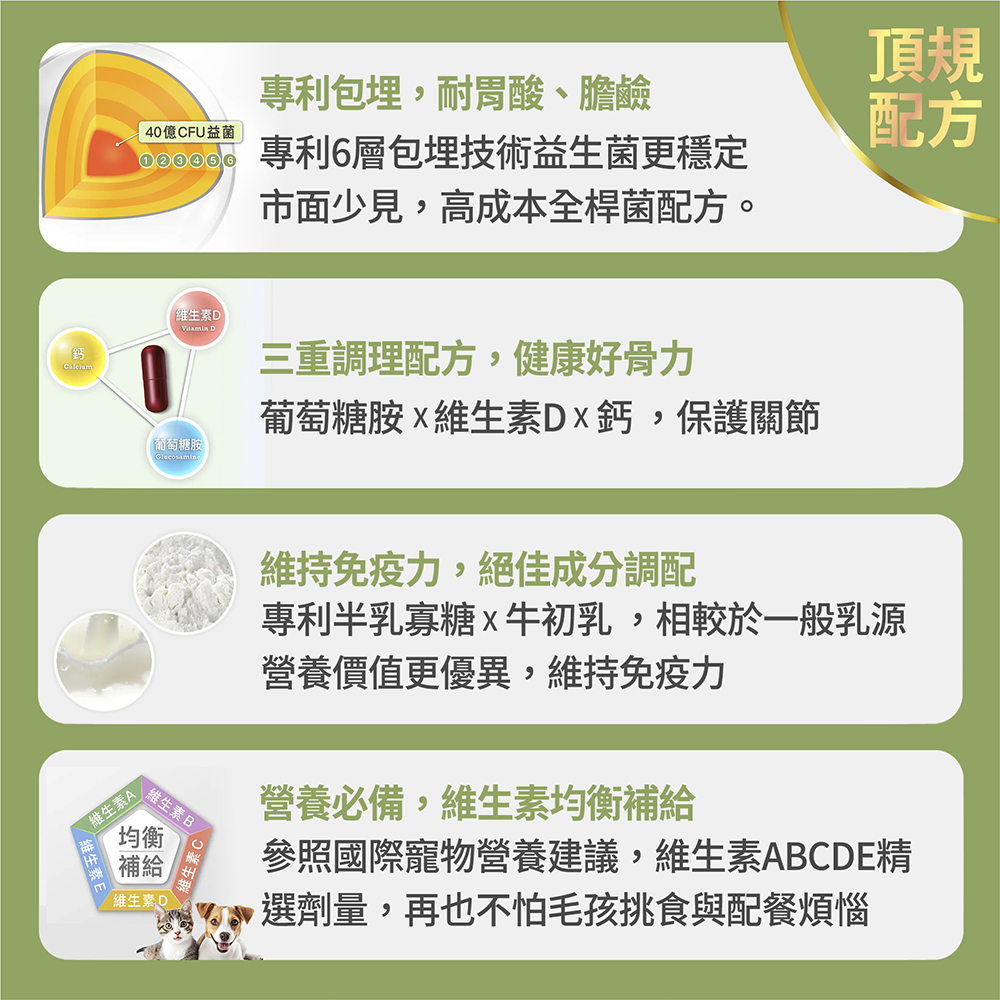 ➤首創寵物全能精華-腸胃調理、綜合營養、骨骼、免疫