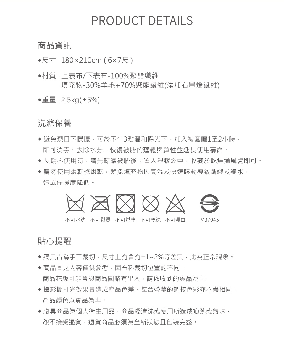 ◆材質說明 : 表布:100%聚酯纖維◆填充物:30%羊毛+70%聚酯纖維(添加石墨烯纖維)◆規格 : 雙人-含布套總重約2.5kg±5%◆件數 : 1◆尺寸 : 雙人-6x7尺(180x210cm)◆產地 : 台灣◆備註 : 含布套總重約2.5kg±5%