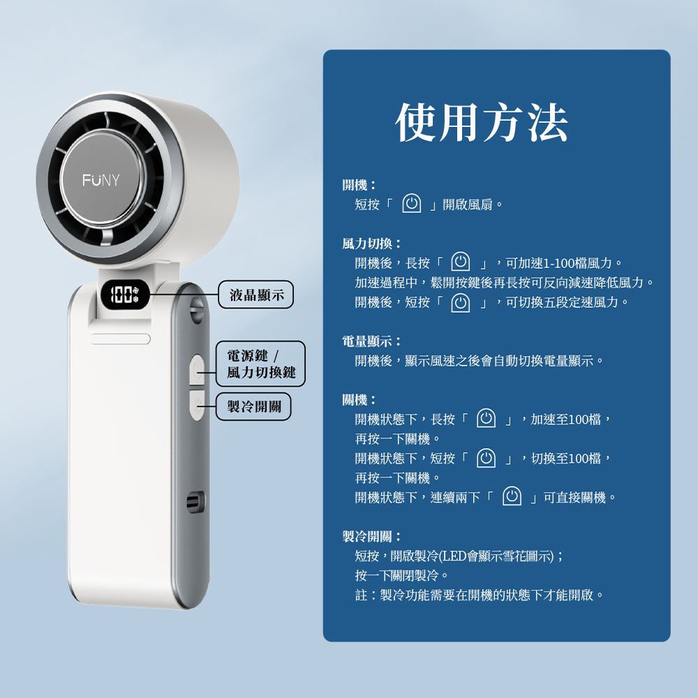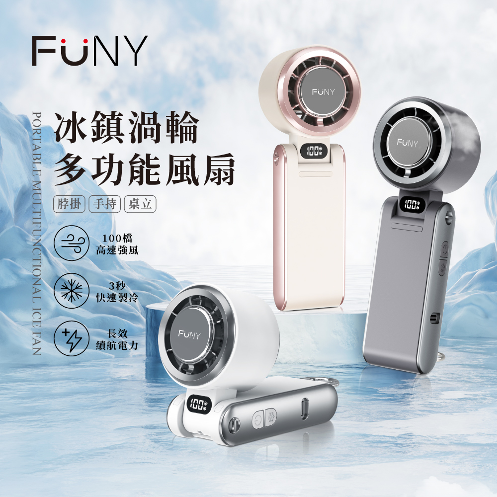 2025年強勢推出【FUNY 冰鎮渦輪多功能風扇】,除了承續 FUNY冰鎮一代的優點:「3秒製冷、100檔無級強風、液晶顯示」之外,升級版設計還增加了「底部掛勾可桌立、側邊掛孔可脖掛、風扇頭部可折角」,無論怎麼吹都很涼