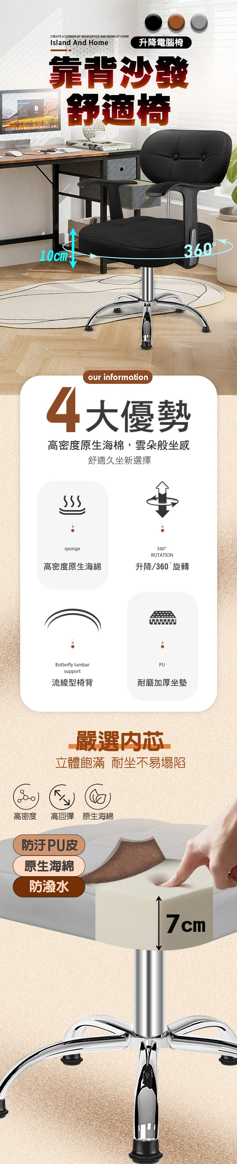 材質:坐布-PU皮革 包覆海綿;支架、扶手-電鍍金屬;椅輪-固定腳墊