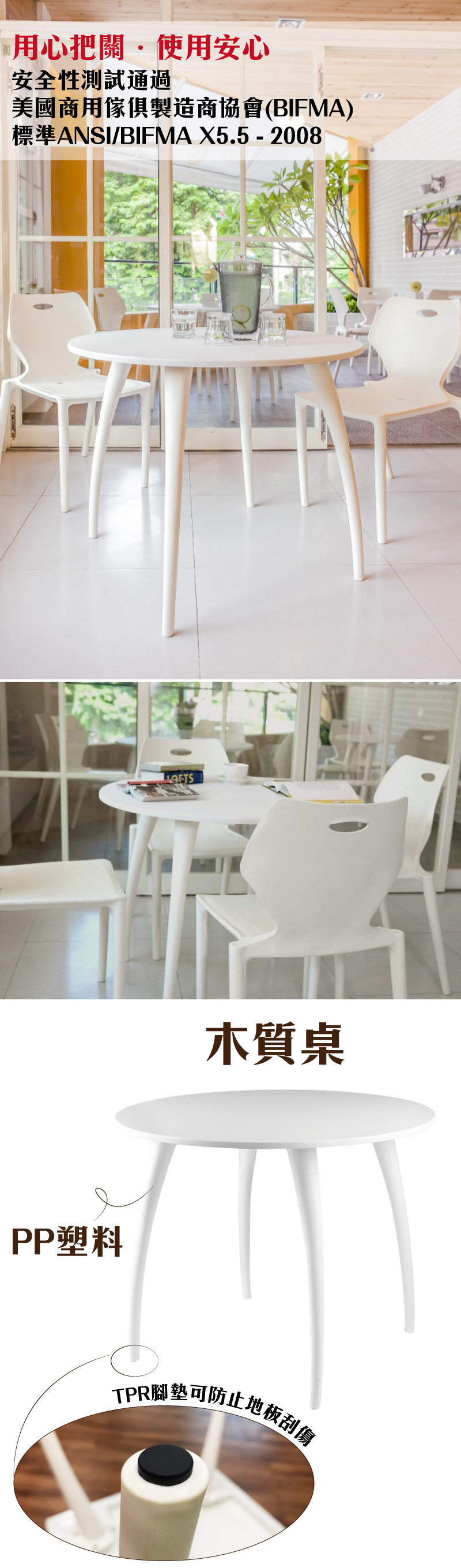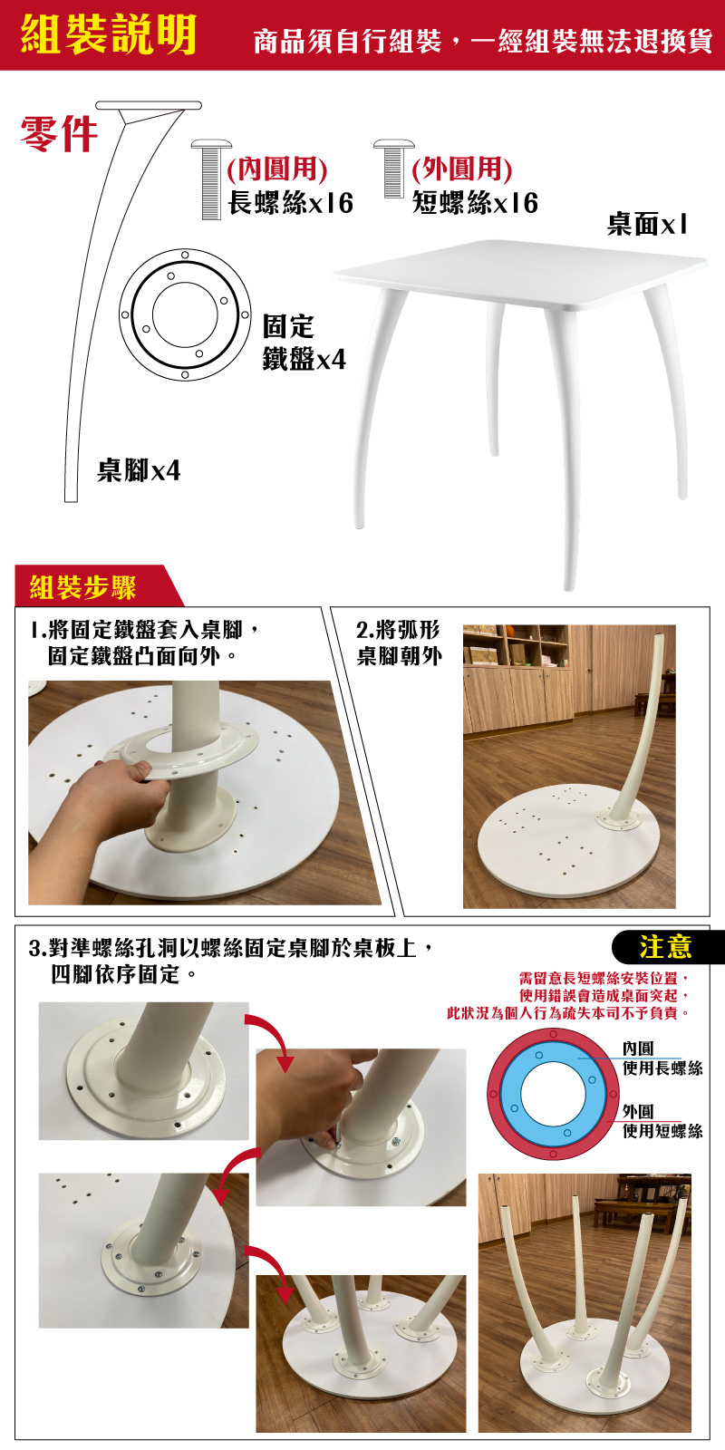 商品尺寸:長寬(直徑)90x高72 cm±3%單張重量:12 公斤±3%材質:耐候木質桌板、PP桌腳組裝方式:需自行安裝,請參考組裝說明產品內容:桌子、安裝零件產地:臺灣製造注意事項:商品一經拆封使用安裝,恕不退換貨。