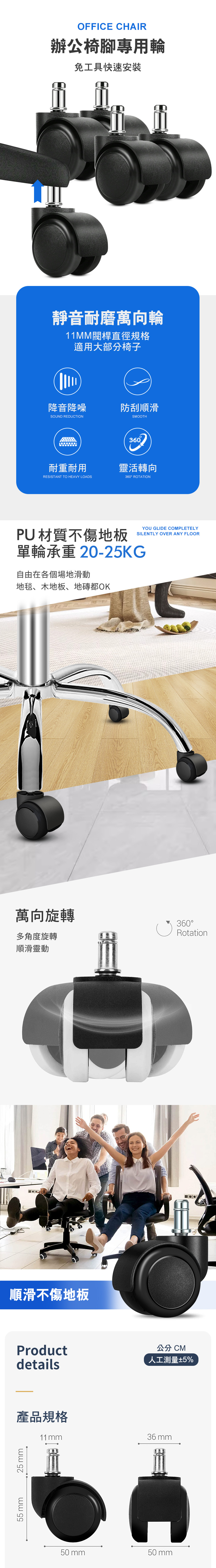 單輪直徑:50 mm±3%乘重:20-25 kg/輪材質:輪(PU+尼龍)、卡簧、塑件插桿高度:22mm,直軸上芯11x22mm (購買前請務必測量) <請留意>IKEA椅軸芯為10x25mm,無法使用此輪款,請勿購買產地:中國