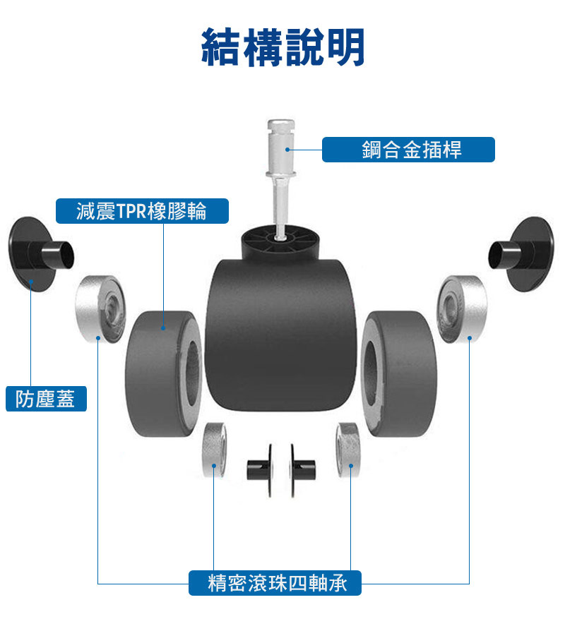 材質:TPR橡膠輪、卡簧、四軸承、塑件