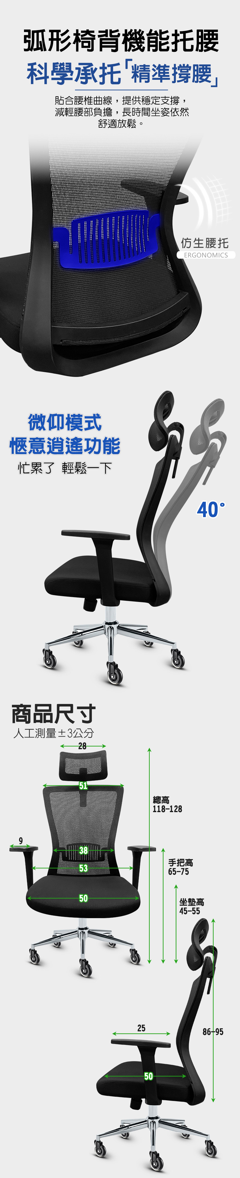 配置: 椅背-彈性透氣網布 坐墊-彈性網布(PU泡棉) 腳架-錐形亮銀色腳架 椅輪-PU2.5吋透明黑輪 材質:彈性透氣網布、PU扶手、尼龍 組裝方式:無須組裝、拆封可用 乘載重量:靜壓約200公斤 尺寸:詳情請見商品內文圖 產地:台灣 注意事項: ◆大約1~3個工作天內送貨到府(不含假日)。 ◆購買時請注意商品尺寸大小測量是否合適您的辦公空間再進行下單,避免一切退換貨之手續影響您的權益。 ◆簽收商品前,請先留意貨物是否完整,若有明顯破損損壞等狀況,不簽收並拒收;若已簽收不拆包裹拍照保留狀況聯繫客服處理相關事宜。 ◆辦理退貨商品必須是全新狀態且包裝完整,商品退回若包裝不完整造成運送損傷將會影響你退貨權限,請特別注意。 ◆賣場商品圖因電腦螢幕設定差異會略有不同,請以實品顏色為準,敬請見諒! ◆商品皆由台灣師傅手工製作範圍稍差距為正常。 ◆商品免組裝,拆封即可使用,滾輪也是裝好的,運送過程中會因推椅子上下貨車滑動而沾上灰塵是正常的,並非瑕疵品!只要擦拭過就沒問題喔! ◆貨運認定之困難配送區域(山區、鄉鎮、所有公家機關、學校、醫院、百貨公司、世貿中心、服務區),不做配送;貨下一樓,不做上樓層等附加運送。"有配送地點疑慮,建議下單前與客服聯繫確認"