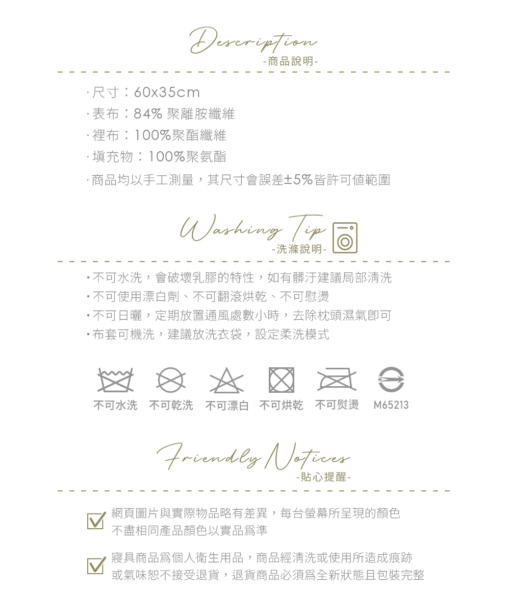 ·尺寸:60x35cm±2·表布:84% 聚離胺纖維·裡布:100%聚酯纖維·填充物:100%聚氨酯·商檢字號:M65213注意事項:·不可水洗,會破壞乳膠的特性,如有髒汙建議局部清洗·不可使用漂白劑、不可翻滾烘乾、不可慰燙·不可日曬,定期放置通風處數小時,去除枕頭濕氣即可·布套可機洗,建議放洗衣袋,設定柔洗模式·網頁圖片與實際物品略有差異,每台螢幕所呈現的顏色,不盡相同產品顏色以實品為準·寢具商品為個人衛生用品,商品經清洗或使用所造成痕跡或氣味恕不接受退貨,退貨商品必須為全新狀態且包裝完整