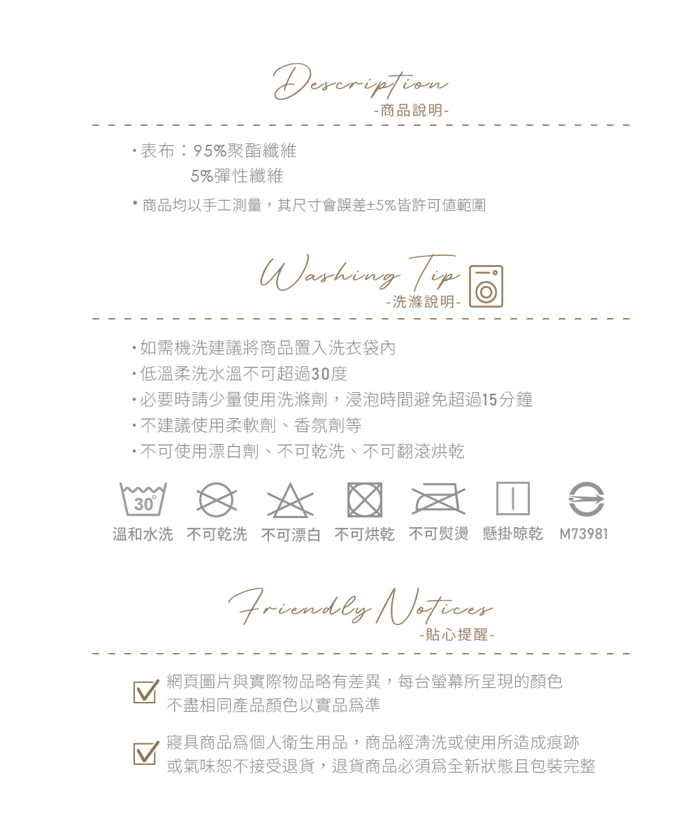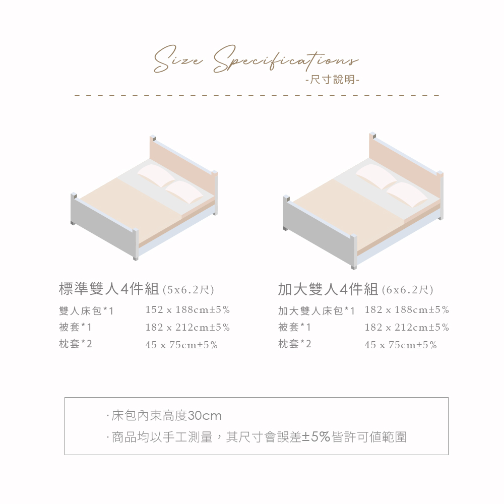 材質:95%聚酯纖維、5%彈性纖維尺寸:標準雙人4件組(5x6.2尺)雙人床包*1:152x188cm±5%薄被套*1:182x212cm±5%枕套*2:45x75cm±5%產地:中國顏色:產品如圖示,網頁圖片因拍攝關係或螢幕色差,與實品略有差異,產品圖僅供參考,實品顏色更佳。清潔方式:可水洗(水溫不超過攝氏30度)/不可乾洗/不可烘乾/不可漂白/不可熨燙/懸掛晾乾※請使用大型洗衣袋清洗,可保持色澤鮮明,更不易造成勾紗等現象。特別說明:網頁圖片僅為示意圖參考,不含拍攝道具,實際出貨件數以「商品內容」說明為主。商檢局檢驗字號:M73981