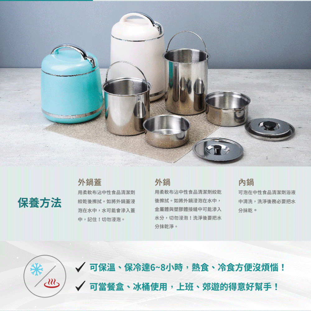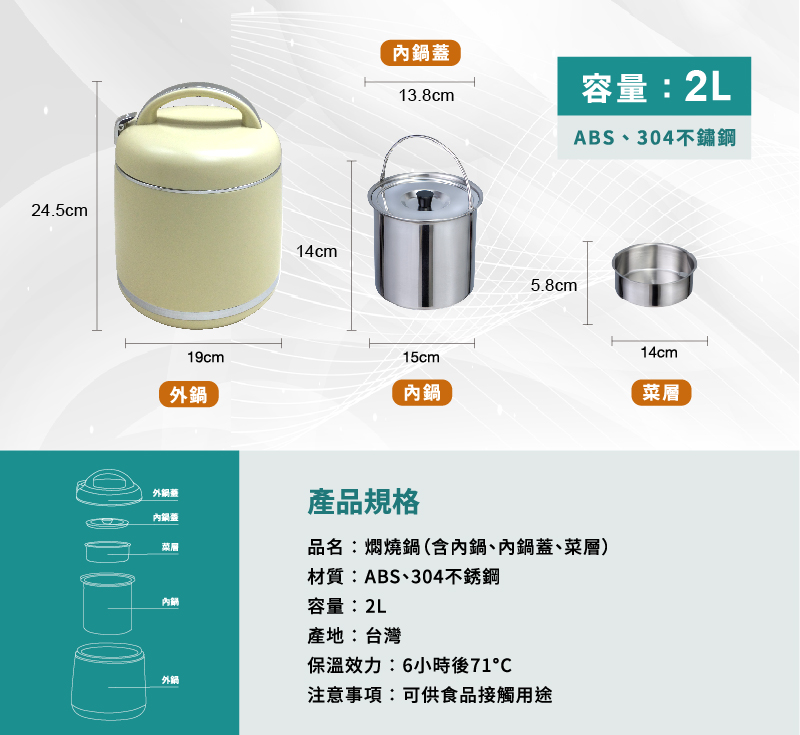 材質:ABS、304不鏽鋼保溫效力:6小時後 63℃尺寸外鍋19cm*19cm*H24.5cm內鍋 15cm*15cm*H14cm內鍋蓋直徑 13.8cm菜層 14cm*14cm*H5.8cm容量 2L