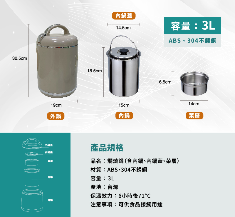 材質:ABS、304不鏽鋼尺寸外鍋 19cm*19cm*H30.5cm內鍋 15cm*15cm*H18.5cm內鍋蓋直徑 14.5cm菜層 14cm*14cm*H6.5cm容量 3L