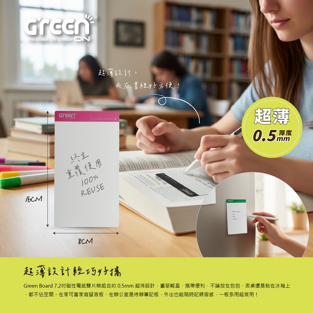 Green Board 7.2吋磁性電紙板約 0.5mm 超薄設計,重量輕盈、攜帶便利,不論放在包包、書桌還是貼在冰上,都不佔空間。在家可當家庭留言板、在辦公室是待辦筆記板,外出也能隨時記錄靈感,一板多用超實用!