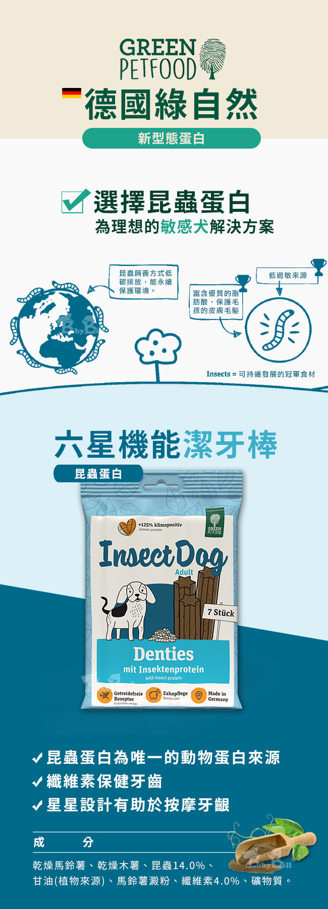 ●昆蟲蛋白為唯一的動物蛋白來源。●纖維素保健牙齒。●星星設計有助於按摩牙齦。●採用昆蟲、蔬食替代動物性蛋白質。●新型態蛋白質來源,減少碳足跡,友善環境。●由營養學家、動物專家和獸醫共同研發,不使用動物測試。●無麩質低敏,不含人工色素,調味劑和防腐劑。【德國原裝原袋進口 】【多項獎項及認證把關 】●Green Brand生態可持續發展奬19/2020和21/2022最先獲得此項殊榮的德國寵物業者。●德國petonline.de 16/2017和17/2018創新產品奬。●榮獲德國DLG優質寵物食品認證,生產過程經過嚴格檢測和審核。●榮獲MeinAllergie Portal數位健康英雄獎。●ISO 9001:2008品質管理認證。●通過環境管理審核規章。●通過國際食品標準認證。※您不會在我們的飼料中看到完整的昆蟲、觸角或昆蟲殼。