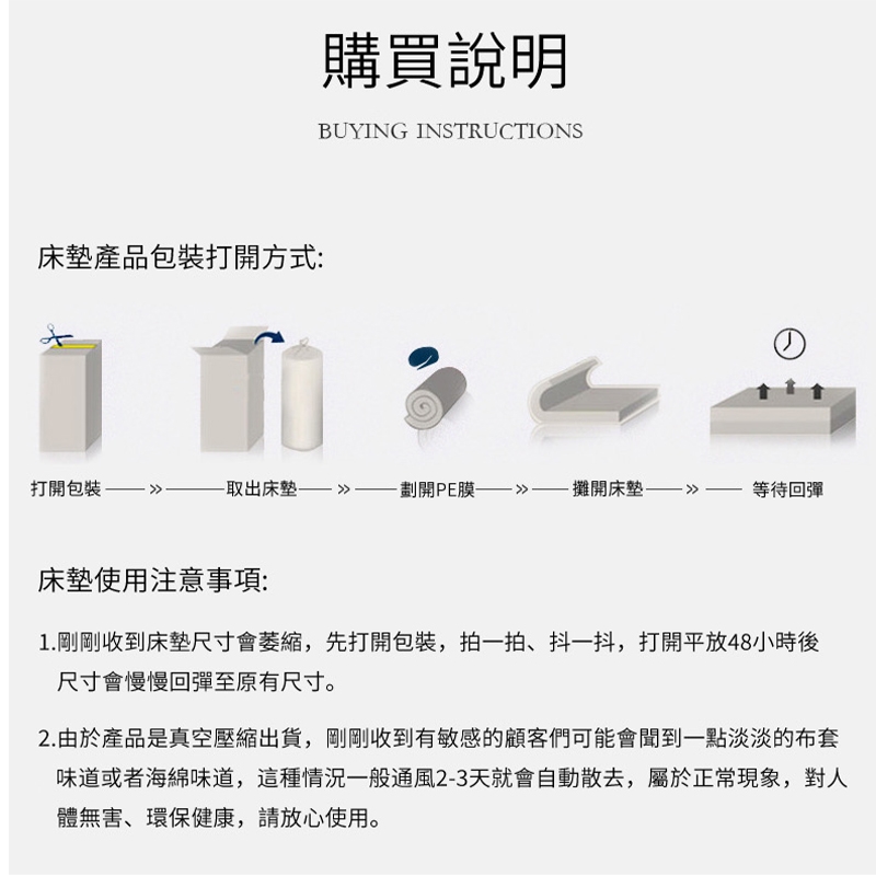.注意事項:床墊屬個人衛生用品,經拆封過後恕不接受退換貨。