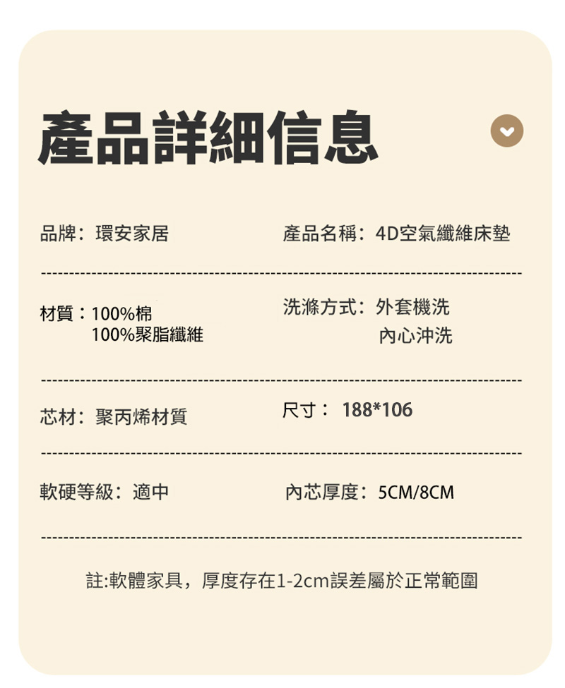 5.可水洗內芯:方便清潔和保持床墊的衛生,您可以定期將內芯取出並洗滌。
