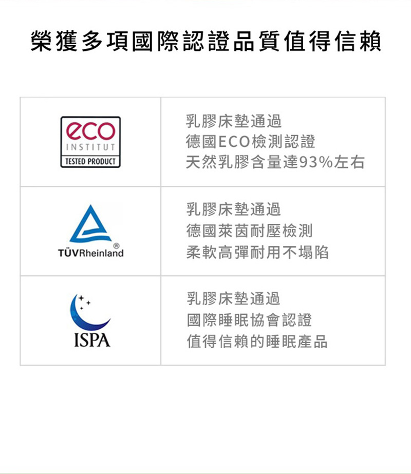 天然純正:選用 15 年以上植物蛋白充足的橡膠樹原液,從凌晨割膠到開始生產不超過 24 小時,乳膠清新乳香,質地 Q 彈柔軟。