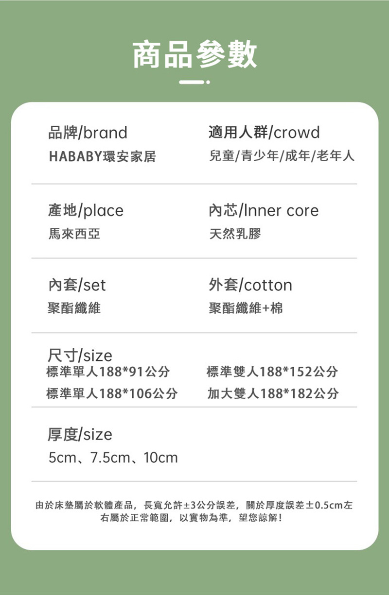 HABABY環安家居乳膠床墊(厚10公分) 162*85(168*88床型用)