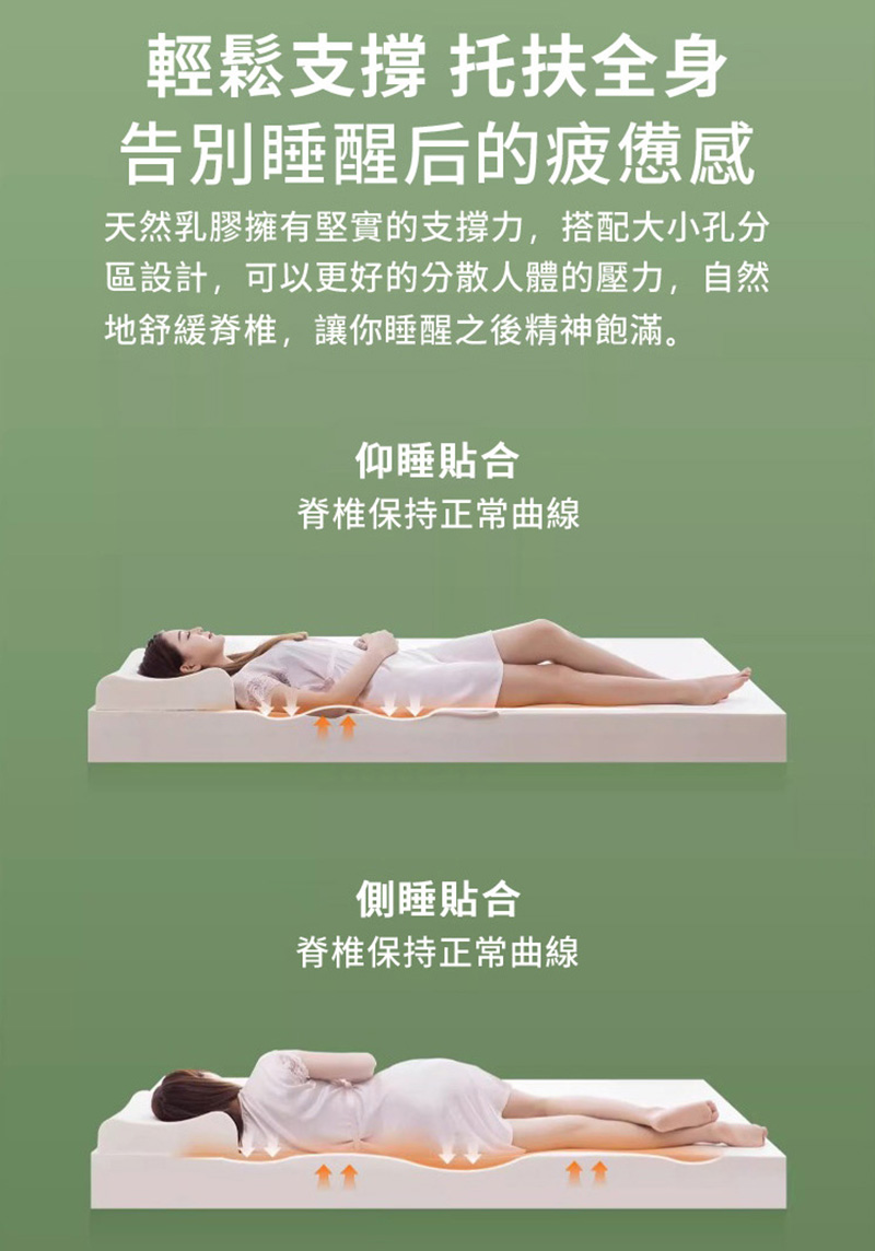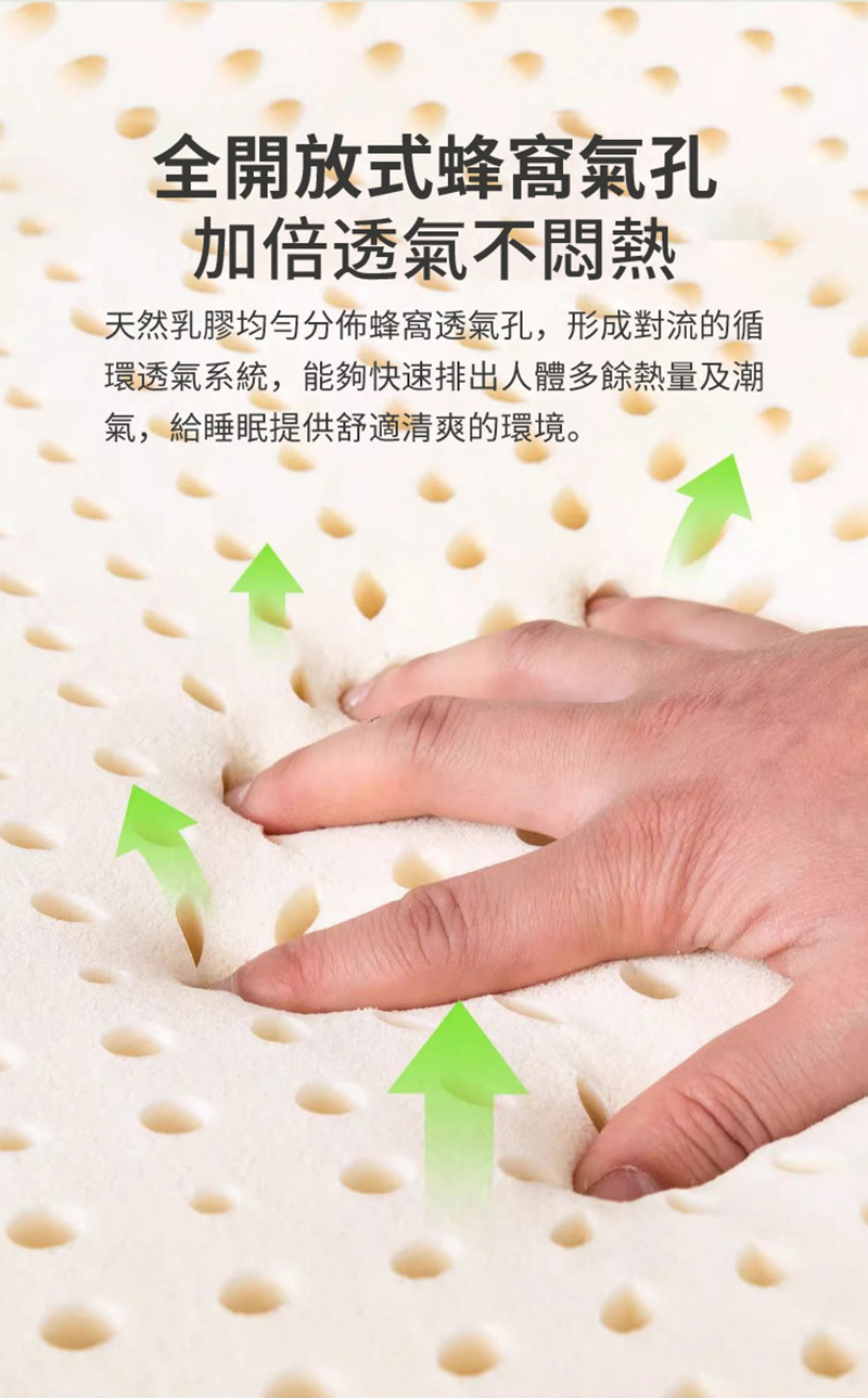 透氣舒適:天然乳膠均勻分佈全開放式蜂窩氣孔,形成對流循環透氣系統,能快速排出人體多餘熱量及潮氣,睡眠時倍感舒適清爽。