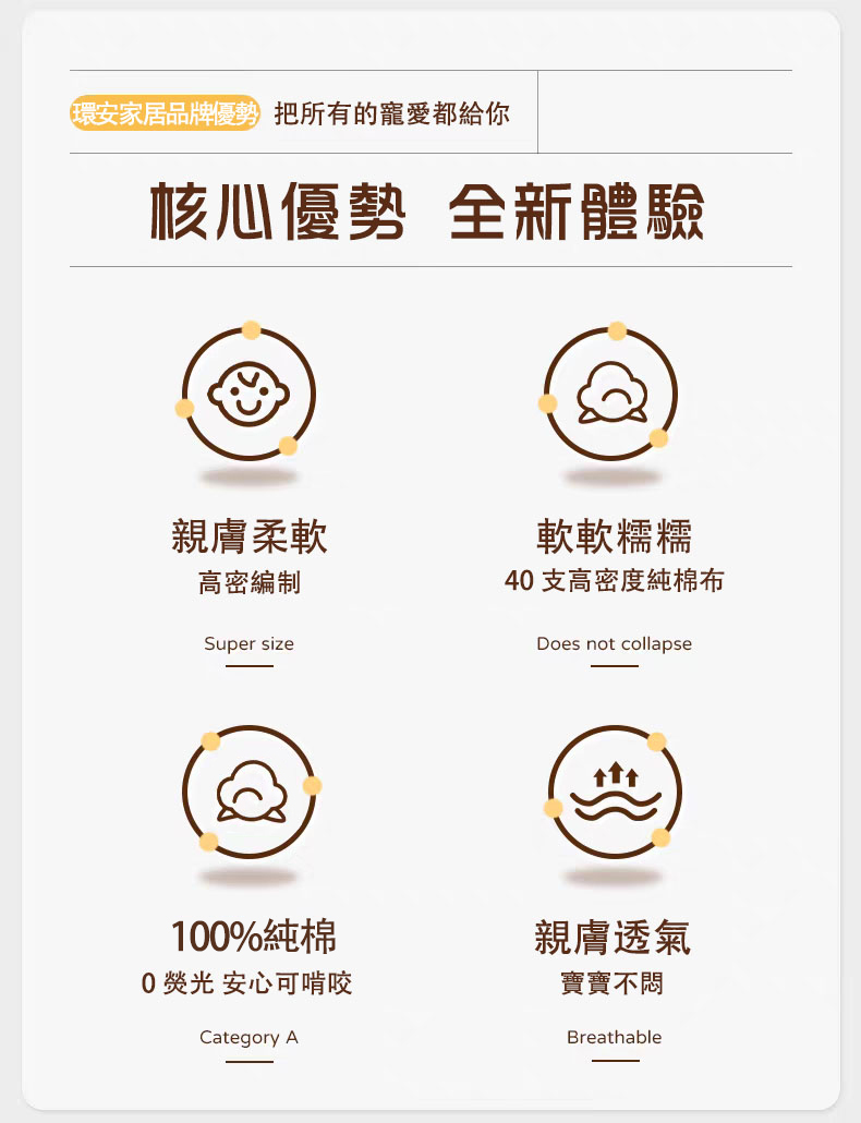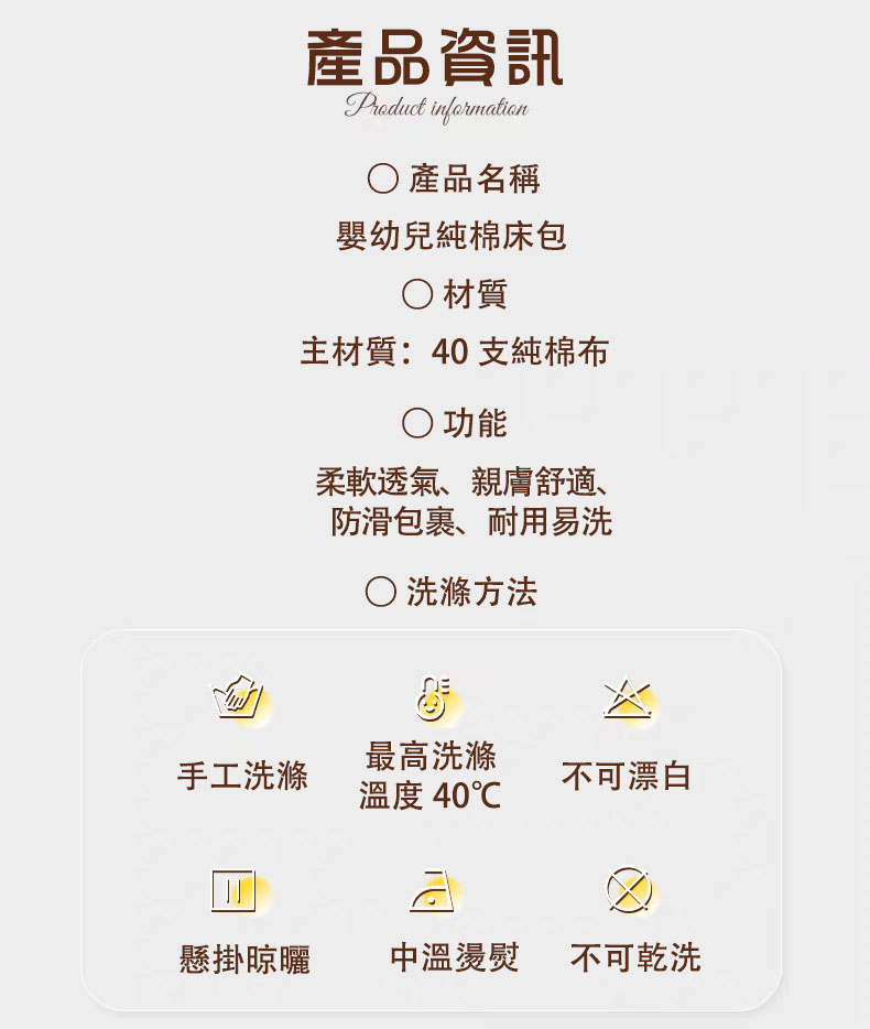 �� 40支精梳綿質感:採用高密度的40支線純棉材質,提供極致的柔軟與舒適,讓寶寶在夢鄉中也能享受如雲朵般的輕柔觸感。
