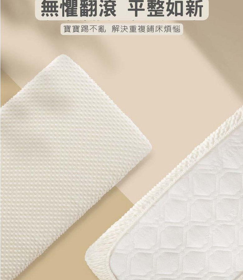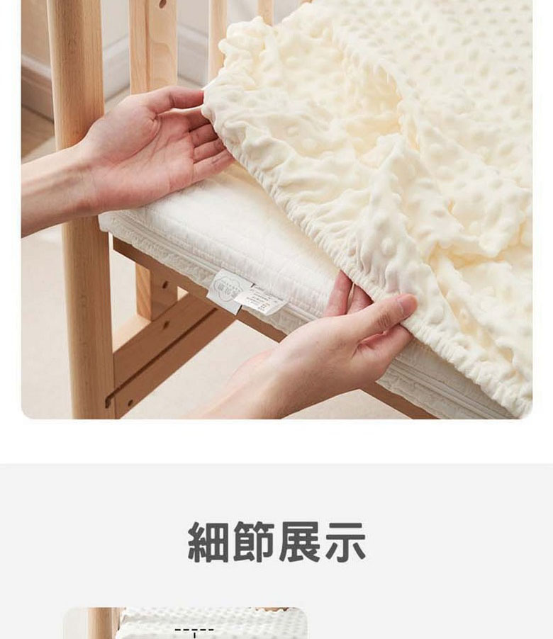 貼合床墊,不易移位:配備優質鬆緊帶,能全面包裹床墊,輕鬆套住不滑落,寶寶隨意翻滾踢動,床笠依舊平整如新,解決反復鋪床的煩惱。