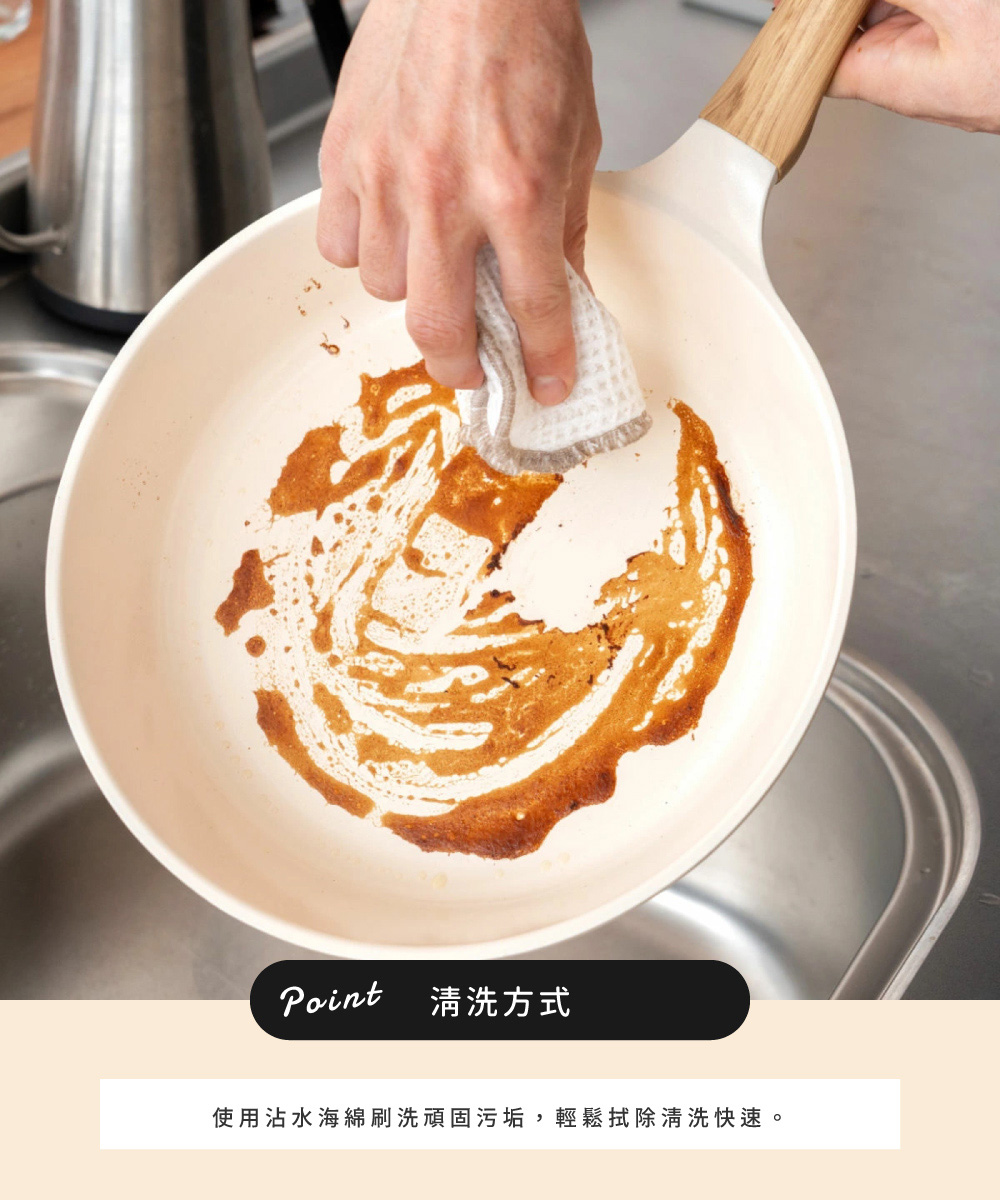 實施了打磨、陶瓷基底與內、外共六層陶瓷不沾處理加工,不僅不易沾黏也擁有極佳滑順度。