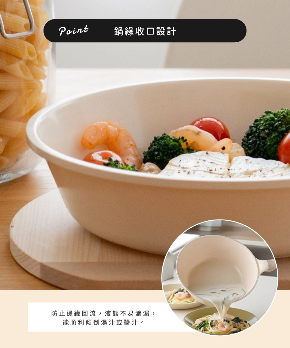 鍋緣為收口設計,液態不易滴漏,能順利傾倒湯汁或醬汁。