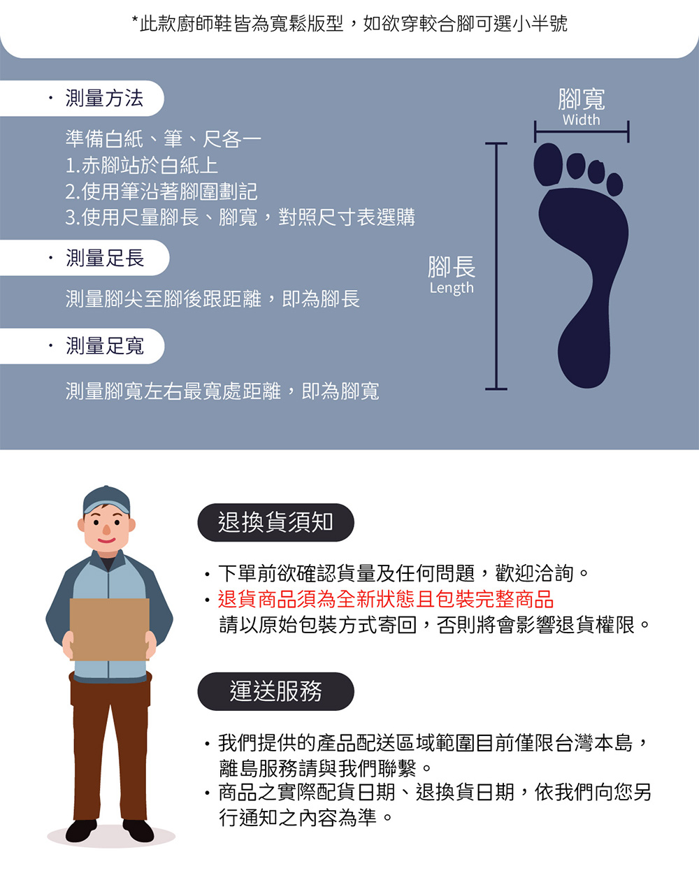 產品:MIT防水一體成型廚師鞋工作鞋拖鞋 5008黑桔男女款(橘LOGO)穿著輕便又舒適一體成型.不脫膠.不怕溼廚房 、戶外、雨天/防水防滑活動式鞋墊可清洗 .清潔又衛生材質:PVC聚氯乙烯產地:台灣本產品符合標準測試規範CNS 15138/CNS 14940/CNS 4797-2/CNS 15204不含:回塑劑/游離甲醛/重金屬/偶氮染料【鑑賞期及退貨注意事項】1.提供15天鑑賞期之權益(含例假日,此為考慮期並非試用期),不可適用於以下情況,如留有污漬、磨損、有異味、配件不全,商品經拆封或使用以致缺乏完整性即失去再販售價值時,恕無法退貨。2.退貨商品須為全新狀態且包裝完整商品,請以原始包裝方式寄回,包含完整無損之外箱、商品、包裝紙,目錄、吊牌、贈品、配件等,若原外箱已遺失,請另使用紙箱包覆於商品原廠包裝外,切勿直接於原包裝上黏貼紙張或書寫文字,來做寄送,若原盒內所有物品有損壞或遺失,恕不接受退貨。3.請注意,以下情況無法受理退貨:●鞋底磨損,或皮底產生刮痕。(請於室內,軟墊上試穿SIZE)●鞋面上有不可清除之髒污。●鞋頭已經楦過、鞋面出現明顯摺痕。●鞋子附屬配件已使用或短缺。因上述的這些情形,會造成該鞋品因為無法再拿來販售的情形而無法退貨,若您試穿後有不合意的地方請您特別注意以上事項。寄回物品時,請在鞋盒外另加包裝,請勿在鞋盒上黏貼膠帶或宅配單,若造成鞋盒損壞恕不接受退換喔4.下單前欲確認貨量及任何問題歡迎使用聊聊洽詢。