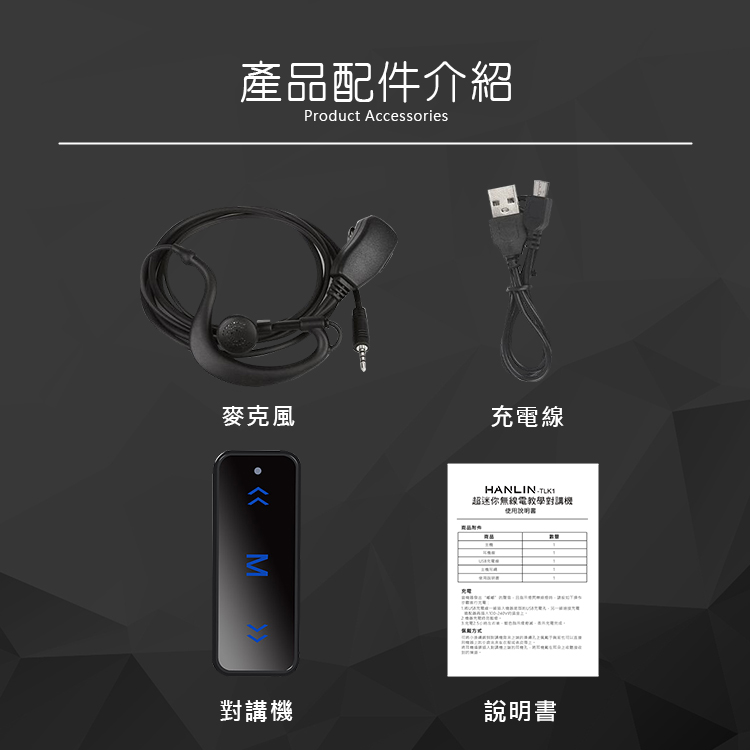 HANLIN-TLK1 迷你無線電耳機式對講機使用無線對講機,即時對講免通話費!快速方便~ 一鍵傳遞訊息,具超強訊號和音質,給您的生活可以帶來可靠、清晰、高效的通訊服務。適用範圍: 運動員教學指導/公司/餐廳/導遊/團體/救難隊/巡守隊/露營/酒店/飯店/服務生/建築工地/倉儲物流...等等是即時傳遞通話的好幫手!! 產品特點:1.ㄧ對ㄧ或ㄧ對多 無限制對講2.使用耳機對講 可夾式設計3.精美小巧 方便攜帶4.省電功能,續航時間20小時5.電池與機身的嚴密結合 防撥水又防塵6.傳輸距離:約1公里 (視環境狀況而不同)7.語音報頻,14個頻道可用8.免裝電池USB充電 產品規格:品名:HANLIN-TLK1 迷你無線電耳機式對講機品牌:HANLIN型號:TLK1頻道:14個主機尺寸:66mm*26mm*14mm頻率:467.5125-467.6750 頻率功率: < 5W充電: DC 5V usb電池容量:600mah(鋰電池)傳輸距離:1~2公里 (視環境狀況而不同)內容物: 主機*1/說明書*1/耳機*1/充電線*1/吊繩*1顏色:黑色NCC認證號 CCAB17LP2460T2注意事項:1.拉扯耳機線容易造成接觸不良!2.無喇叭擴音 必須使用耳機!15,16為備用空頻使用頻率(1) 467.5125(2) 467.525(3) 467.5375(4) 467.550(5) 467.5625(6) 467.575(7) 467.5875(8) 467.60(9) 467.6125(10) 467.625(11) 467.6375(12) 467.650(13) 467.6625(14) 467.675(15) 無(16) 無以上為台灣NCC規定的頻率常見問答:1.若有前後批次機器不通用的狀況~請用寫頻線修改 答: 若要修改頻率 請自行用寫頻線跟寫頻軟體修改,如果寫頻軟體內有加密 (有解碼 ,有編碼) 請改成 ( 無 ) 頻率一樣才能相通礙於NCC規定,因此我們不開放客戶修改機器,也不得任意修改2. 什麼是DCS碼? 就是給頻率加密的 防止別人竊聽答:需要通過電腦寫頻軟件加密操作礙於NCC規定,因此我們不開放客戶修改機器,也不得任意修改3. 什麼是掃描功能?答:操作此功能也要透過電腦寫頻軟件打開設定,才能在機子上使用掃描功能礙於NCC規定,因此我們不開放客戶修改機器,也不得任意修改