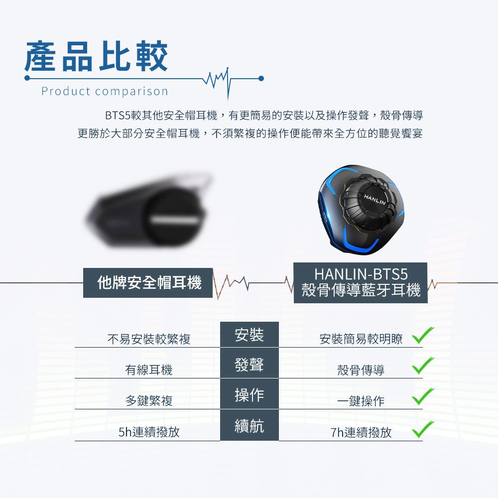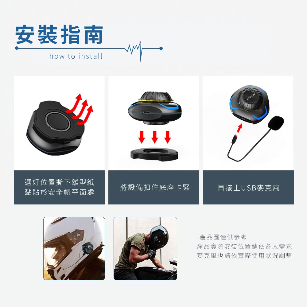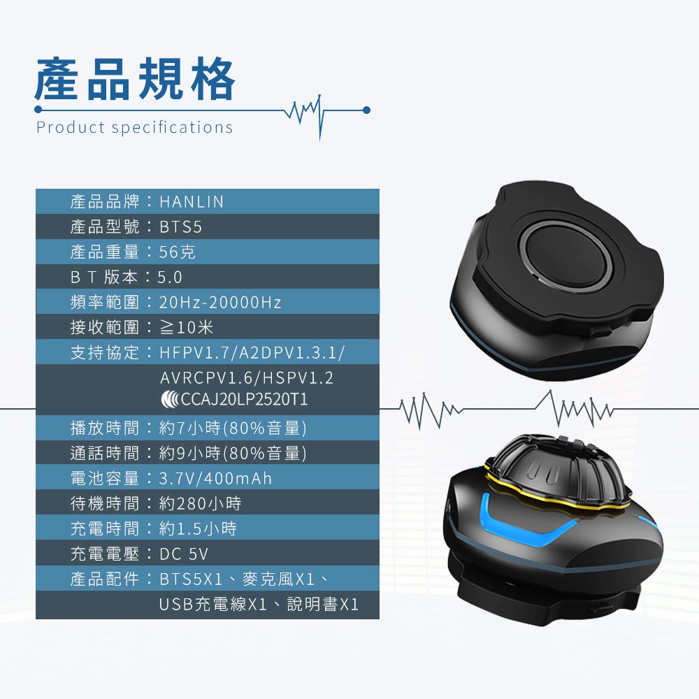 ANLIN-BTS5 殼骨傳導安全帽藍芽耳機 -藍牙5.0購買前須知:此產品因為是殼骨傳導技術 ,不同一般喇叭會因安裝黏貼位置有音量有所不同安全帽的內裡厚薄也會影響音量大小安裝前務必先測試黏貼位置建議平常使用在70公里以下較能聽的清楚騎行速度過快時,可能因為風切聲或機車聲等 蓋過內部聲音產品特點: 1.通用98%的全罩安全帽及耳罩式安全帽外加式:專門為您而生,讓每個騎行 都能輕鬆快速的安裝使用2.地圖語音導航使用~呼叫SIRI 宛如鋼鐵人頭盔內的語音助理!3. 安裝5秒:免除複雜安裝步驟、創新免走線!拆裝容易:免擔心裝不進車廂!免擔心被偷走!4. 最新殼骨傳導振動技術震動你的安全帽~讓整個安全帽都是你的喇叭!!連續播放音樂 ~最大音量約7小時5.響度提升,共振超有感通過介質發出360度高音質低音,擁有HIFI級別音效低頻響度提升50%,使低音渾厚有力,音樂細膩呈現6.不塞入耳,騎行更安全骨傳導的共振發聲,比起一般的耳機,更能關注外界聲響讓你保持對周圍的警覺,提升戶外運動以及騎行的安全性7.防水塗層,為戶外而生全封閉式音腔,完全隔絕水分,防止日常雨水滲入類膚材質,易於保養清潔,簡單擦拭即可換然如新8.穩定清晰,支援麥克風隨件附贈抗干擾麥克風,可進行語音通話,更便利語音清楚不失真,使通話更便利穩定,收音更清晰簡易操作說明:按鈕及旋鈕功能為何?A.按鈕功能長按:開機(進入配對藍牙)/關機短按:接聽/停止播放短按兩下:呼叫SiriB.旋鈕功能1.旋轉後放開 (音量調整)2.旋轉後不放 (跳上下曲)使用方式:1.撕開底座背膠貼紙,黏貼於安全帽左側平面處。2.將設備與底座旋轉卡緊。3.將麥克風插入設備USB口使用麥克風。請依實際使用狀況調整麥克風產品圖配戴方式僅供參考產品規格產品品牌:HANLIN產品型號:BTS5產品重量:56克藍牙版本:5.0 (高通 QCC3003)頻率範圍:20Hz-20000Hz接收範圍:≦ 10米支持協定:HFPV1.7/A2DPV1.3.1/ AVRCPV1.6/HSPV1.2防水等級: IP68播放時間:約7小時(80%音量)通話時間:約9小時(80%音量)電池容量:3.7V/400mAh待機時間:約280小時充電時間:約1.5小時充電電壓:DC 5V產品配件:主機BTS5x1,卡扣底座x1, 24cm蛇管麥克風x1, 麥克風固定夾x1, USB充電線x1, 說明書x1產品尺寸: 長6.13cm x 寬6.13cm x 厚4cmNCC認證號: CCAJ20LP2520T1注意事項:※所有商品皆為手工測量,尺寸可能有1~3mm誤差。※顏色可能因拍照光線、螢幕不同等原因, 導致可能會有色差。 一切以實物為主。※避免高溫、潮濕或強磁場環境。可加購配件:1.卡扣底座: 寬直徑5.5cmx 厚7mm2.加長硬線蛇管麥克風: 長度45CM3.加長軟線麥克風: 長度45CM4.固定夾重要說明1.長時間收聽音量過大時,可能會帶來不適感,請盡可能使用中等左右音量,避免長時間使用過大音量2.無論音量大小,使用耳機都將影響您對周圍環境的感知,使用耳機時請多加注意3.切勿拆除或改裝耳機,否則可能導致耳機故障或燒毀4.切勿拋扔、做鴨耳機或將其進入水中5.耳機應遠離火、水和高壓設備6.不適合三歲以下兒童使用,內包含細小零件7.請勿將其扔入一般垃圾,須按照當地法規分類回收注意:若用戶違反以上警告內容,造成人身財產損失,本公司不負擔任何責任