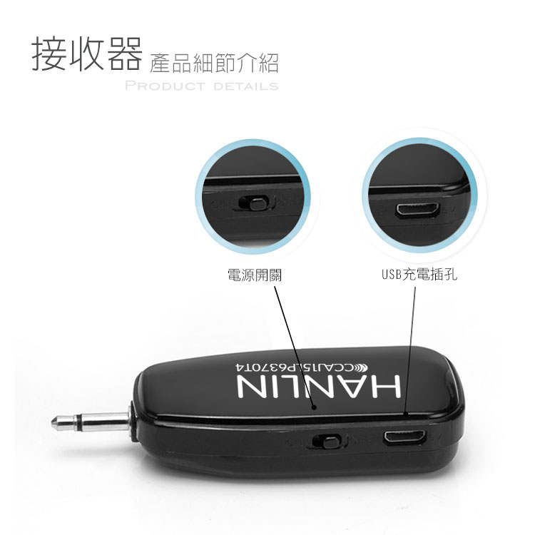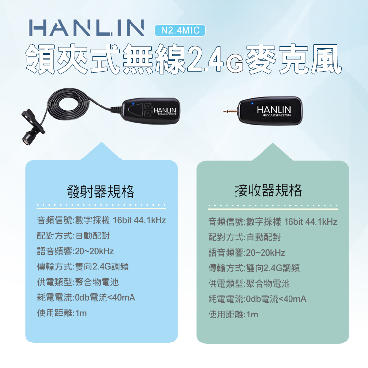 HANLIN-N2.4MIC 領夾式無線2.4G麥克風隨插即用免配對2.4G的 領夾無線麥克風 傳輸距離遠 音質清楚 干擾極小不同於藍芽與FM需配手動對連線此產品設計免配對 隨插即用【產品應用廣泛】老師/學校/教學/導遊/會議/小型演出/地攤叫賣/產品特點:1.領夾式 免頭戴 2.高清收音3.隨插即用 免藍芽繁瑣配對4.採用2.4G頻率 能夠有效不被環境干擾使用方法:1將接收器插入音響接收端2打開接收器跟麥克風上面的開關3一音量調整大小聲 開始使用4使用時間依音量大小有所不同產品規格領夾N2.4G麥克風品牌:HANLIN 型號:N2.4MIC音頻信號:數字採樣配對方式:自動配對信噪比:≥85dB傳輸頻率:2480MHZ-2483MHZ語音頻響:20HZ-20KHZ傳輸方式:雙向2.4G供電方式:內置400MAH聚和物電池功耗:0db電流<40mA音頻輸出:混合輸出內容物: 麥克風/接收器/充電線/轉接頭/海棉/說明書NCC認證CCAJ15LP6370T4