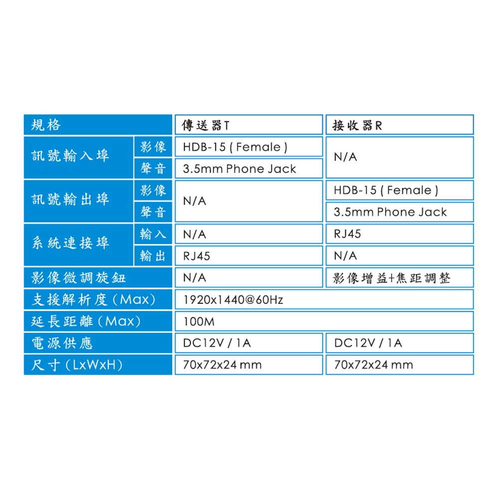 傳送器與接收器之間,使用一條 CAT.5/5E 纜線作連接,即可將 VGA+Audio 訊號做延長,最遠距離可達 100 公尺