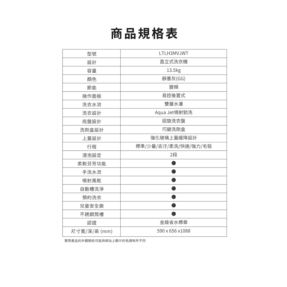■ 商品送達後若因買家因素無法安裝或拒收,買家需負擔賣家出貨產生的物流費用商品特色:Aqua Jet噴射勁洗 提升洗淨效果雙層水瀑搭載迴旋洗衣盤手洗水流滿足預洗需求噴射風乾減少晒衣時間全新節能省水行程浸泡及柔軟芳芬功能自動清潔內槽巧變洗劑盒洗劑輕鬆分配易控後置式面板及加大筒槽輕鬆拿取強化玻璃上蓋緩降設計變頻馬達高效洗衣商品規格:型號:LTLH3MVJWT容量:13.5㎏顏色:靜墨灰(GG)電源:110V / 60Hz馬達:變頻尺寸:寬590 x 深656 x 高1088 mm重量:45kg省水標章:金級產地:泰國保固:全機1年、機板,運轉組3年、馬達,壓縮機5年BSMI:R31270貨源:公司貨本商品資訊由網路及官網收集彙整而成,僅供參考,如有更新或異動不另外通知,正確商品資訊及規格以實機為準。鑑賞期非試用期,產品一經拆箱、插電及使用皆會影響您退貨權利並酌收整新費用。廢四機回收資訊:如需回收廢四機請於下單時備註,如未於訂單備註,後續需另派工收回將酌收派工費用500~1200元(跨區費另計)新購公告指定規格之電視機、洗衣機、電冰箱或冷、暖氣機時,販賣業者應提供同項目、數量、時間及同送達地址之廢四機回收(搬、載運)無償服務。但不包含為搬運、拆卸而動用大型機具、工程或危險施工等。消費者本人簽名確認已被口頭告知或知悉上述權益。本站配合環保署廢四機回收服務,本公司廢四機回收專線:0800-550678,環保署資源回收專線0800-085717。