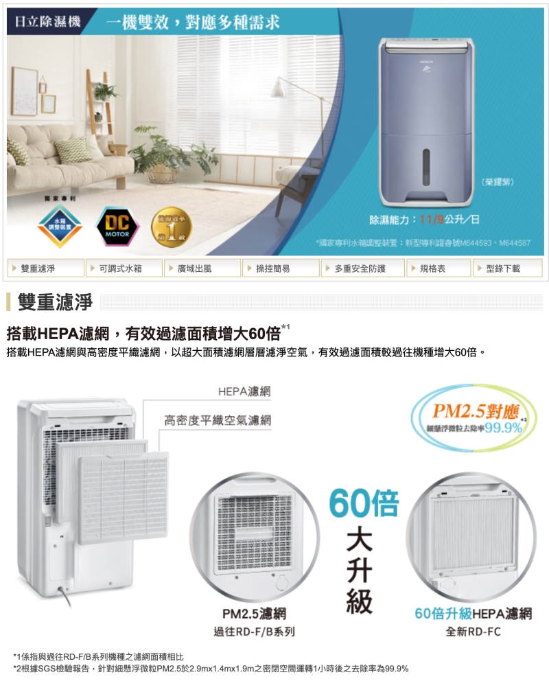 【商品名稱】HITACHI 日立一級能效 11公升 清淨型除濕機 RD-22FC 榮耀紫【原產地】台灣【型號】RD-22FC【顏色】榮耀紫【節能/除濕】 .除濕能力:11 (公升/日) .能源效率等級:第1級【空氣清淨】 .潔淨空氣提供率(Dust)CASR值(cmm):2.12 .能源效率值(Dust)CASR/W(cmm/W):0.208 .待機功率(W):0.85 .能源效率等級:第1級【清淨】 .高密度平織空氣濾網:★ .HEPA濾網:★【貼心設計】 .風向控制:超廣角上吹+前吹 .滿水自動停止運轉:燈號 / 警示聲 .滴水靜音 / 連續排水:★ .底部滑輪:四輪萬向移動 .自定濕度 / 濕度顯示:★ .快速乾衣:★ .定時運轉(h):1~12 h .LED運轉模式指示燈:藍(除濕清淨) / 紅(滿水) / 綠(清淨) .濾網清掃提示:★ .手機APP遙控:另 購 (RC-W04XE)【安全】 .迴轉式壓縮機:★ .停電自動復歸 / 自動除霜:★ .多項防護裝置:★【其他】 .LED面板顯示/ 操控:LED觸控式面板 .R-134a冷媒 / 高效DC馬達:★ .MIT微笑標章:★ .環保標章:申請中 .節能標章:★ .適用室溫範圍:5~35℃ .電源:單相/110V/60Hz .水箱容量:高/低水位二段可調(高:約5公升;低:約3.8公升) .外型尺寸 寬×高×深(mm):365x625x235 .製品重量(kg):16【商品保固】 .3年保固【BSMI商檢字號】R41010【商品特點】 .雲端智慧控 .雙重清淨過濾 .高效除溼#HITACHI #HITACHI 日立 #一級 #能效 #11 #公升 #清淨型 #除濕機 #RD22FC #榮耀 #紫