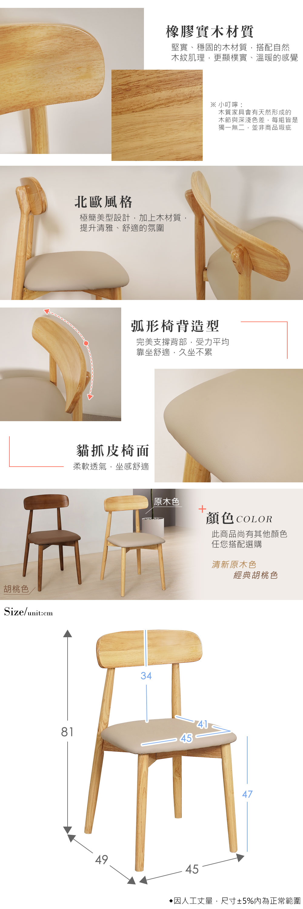 ◆實木材質結構,穩固耐用◆耐磨貓抓皮坐墊,舒適好坐◆弧形椅背設計,靠坐好舒適◆免自行組裝,專人配送到府整體配件:餐椅 x 4入尺寸:寬 45 x 深 49 x 高 81 公分材質:橡膠木、貓抓皮顏色:原木色產地:中國誤差值:因人工丈量,尺寸±5%內為正常範圍