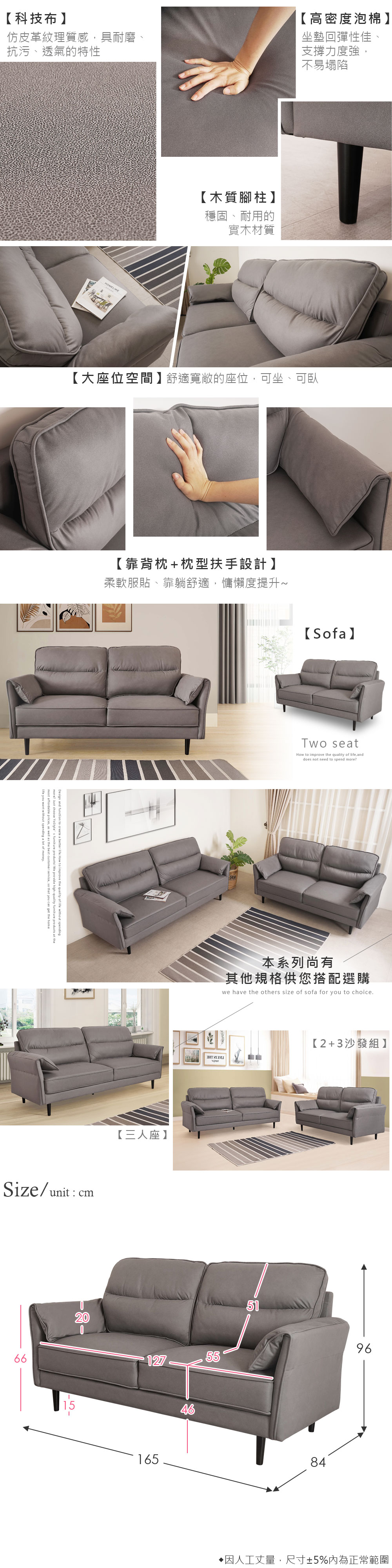 ◆科技布耐磨、抗污、透氣性佳◆表面仿皮革紋理質感◆高密度泡棉坐墊,支撐力強◆木質腳座,穩固且耐用◆舒適、寬敞的大座位空間◆靠背枕+枕型扶手柔軟服貼◆免自行組裝,專人配送到府尺寸:寬 165 x 深 84 x 高 96 公分材質:科技布、高密度泡棉、實木腳顏色:灰色產地:中國誤差值:因人工丈量,尺寸±5%內為正常範圍