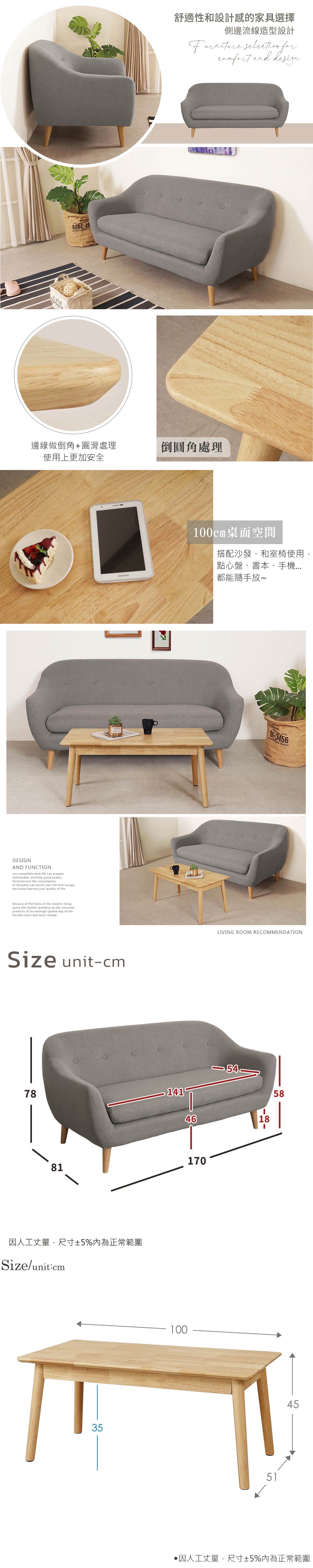 ◆流線造型,簡約時尚◆挑高腳架,方便清掃◆透氣的高密度泡棉坐墊◆茶几實木材質結構,穩固耐用◆專人安裝配送到府沙發尺寸:寬 170 x 深 81 x 高 78 公分材質:亞麻布、實木腳、高密度泡棉顏色:淺灰色