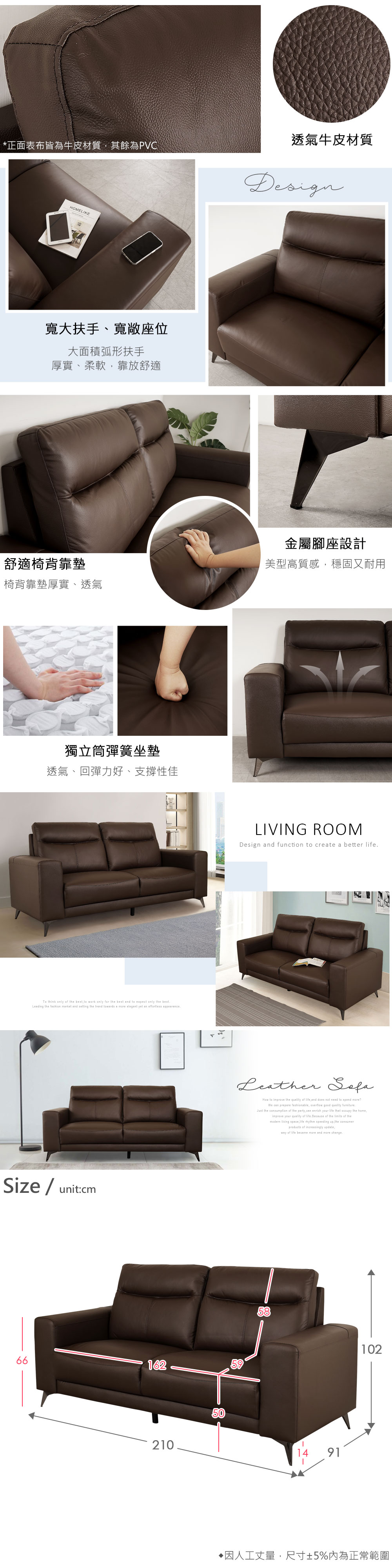 ◆選用高質感、透氣牛皮材質◆支撐性佳的獨立筒坐墊◆寬大扶手,靠放舒適◆柔軟、厚實的舒適椅背靠墊◆金屬腳座設計,穩固又耐用◆免自行組裝,專人配送到府尺寸:寬 210 x 深 91 x 高 102 公分材質:牛皮、PVC顏色:咖啡色產地:中國誤差值:因人工丈量,尺寸±5%內為正常範圍