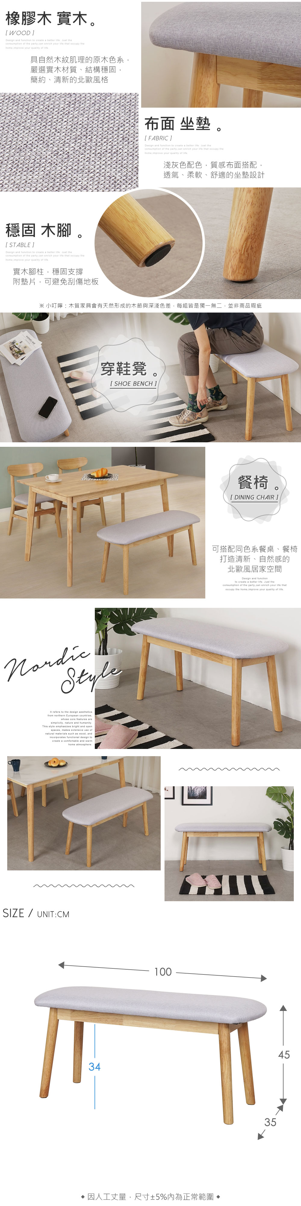 ◆實木材質,結構穩固◆透氣布面椅墊,柔軟舒適◆簡約、具自然感的北歐風格◆可作長凳、餐椅、穿鞋凳使用尺寸:寬 100 x 深 35 x 高 45 公分材質:橡膠木、布顏色:原木色產地:中國誤差值:因人工丈量,尺寸±5%內為正常範圍