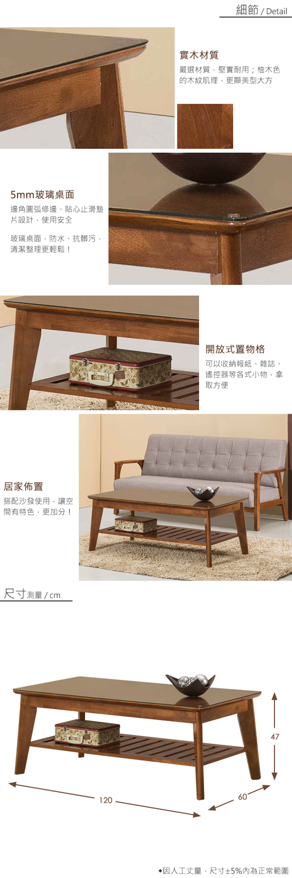 ◆實木材質,結構穩固◆附玻璃,美觀易清潔◆專人配送,到府安裝◆日式、田園風格◆客廳實木質感呈現◆桌下一層收納空間尺寸:寬 120 x 深 60 x 高 47 cm材質:實木、5mm玻璃桌面顏色:柚木色產地:台灣誤差值:因人工丈量,尺寸±5%內為正常範圍