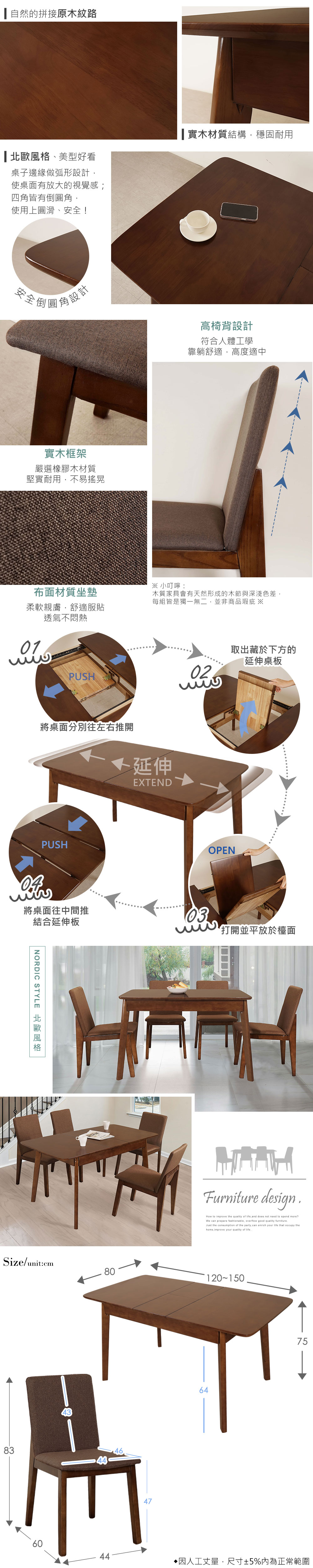 ◆可伸縮延長,機能性佳◆實木材質結構,穩固耐用◆北歐風格餐桌,美型好搭◆質感布面坐墊,舒適好坐◆免自行組裝,專人配送到府整體配件:餐桌 x 1 + 餐椅 x 4桌子尺寸:寬 120~150 x 深 80 x 高 75 公分椅子尺寸:寬 44 x 深 60 x 高 85 公分桌子材質:橡膠木椅子材質:橡膠木、布面顏色:胡桃色產地:中國誤差值:因人工丈量,尺寸±5%內為正常範圍