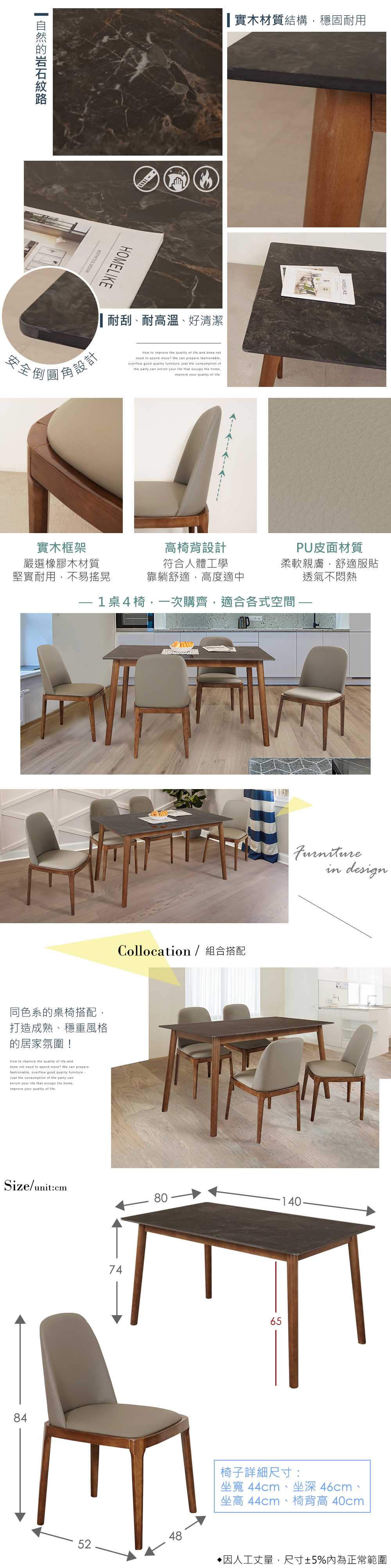 ◆岩板耐刮、耐高溫、好清潔◆實木材質結構,穩固耐用◆北歐風格設計,美型好搭◆一桌四椅,一次購齊◆免自行組裝,專人配送到府整體配件:餐桌 x 1 + 餐椅 x 4桌子尺寸:寬 140 x 深 80 x 高 74 公分椅子尺寸:寬 48 x 深 52 x 高 84 公分桌子材質:橡膠木、岩板椅子材質:橡膠木、PU皮面顏色:胡桃色產地:中國誤差值:因人工丈量,尺寸±5%內為正常範圍