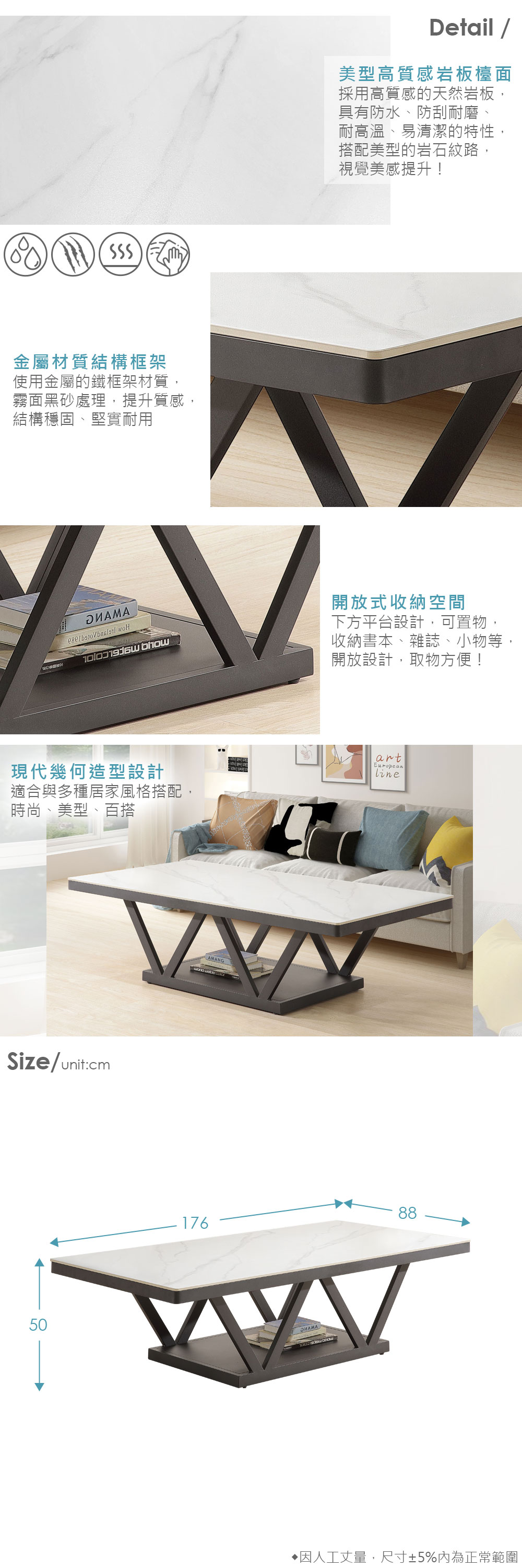 ◆高質感岩板檯面,耐磨、耐高溫、易清潔◆工業風格的霧面黑砂鐵框架,穩固耐用◆具現代感的幾何造型設計,很百搭◆下方開放置物空間,取物很方便◆大尺寸桌面,搭配沙發組使用,大器好看◆免組裝,專人配送到府尺寸:寬 176 x 深 88 x 高 50 公分材質:岩板、高碳鋼管顏色:白色產地:台灣誤差值:因人工丈量,尺寸±5%內為正常範圍