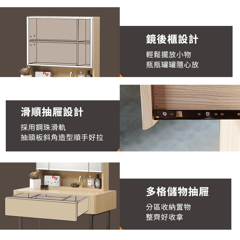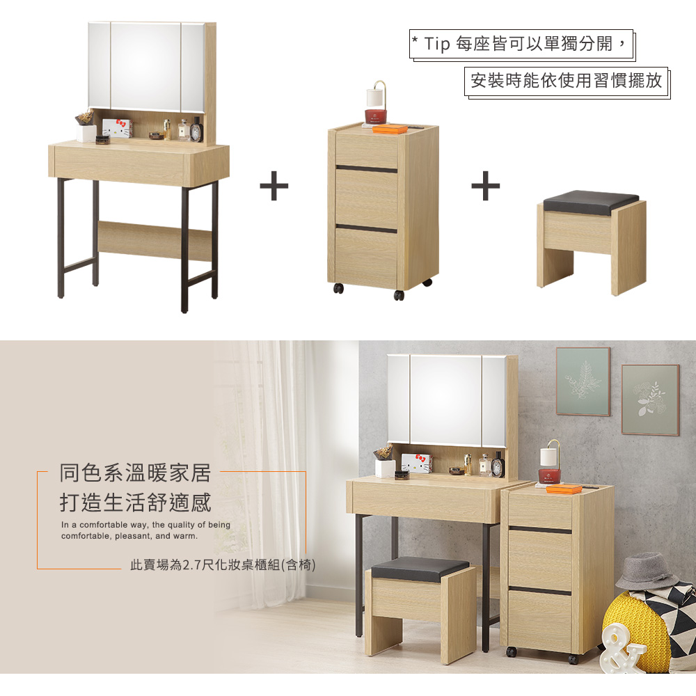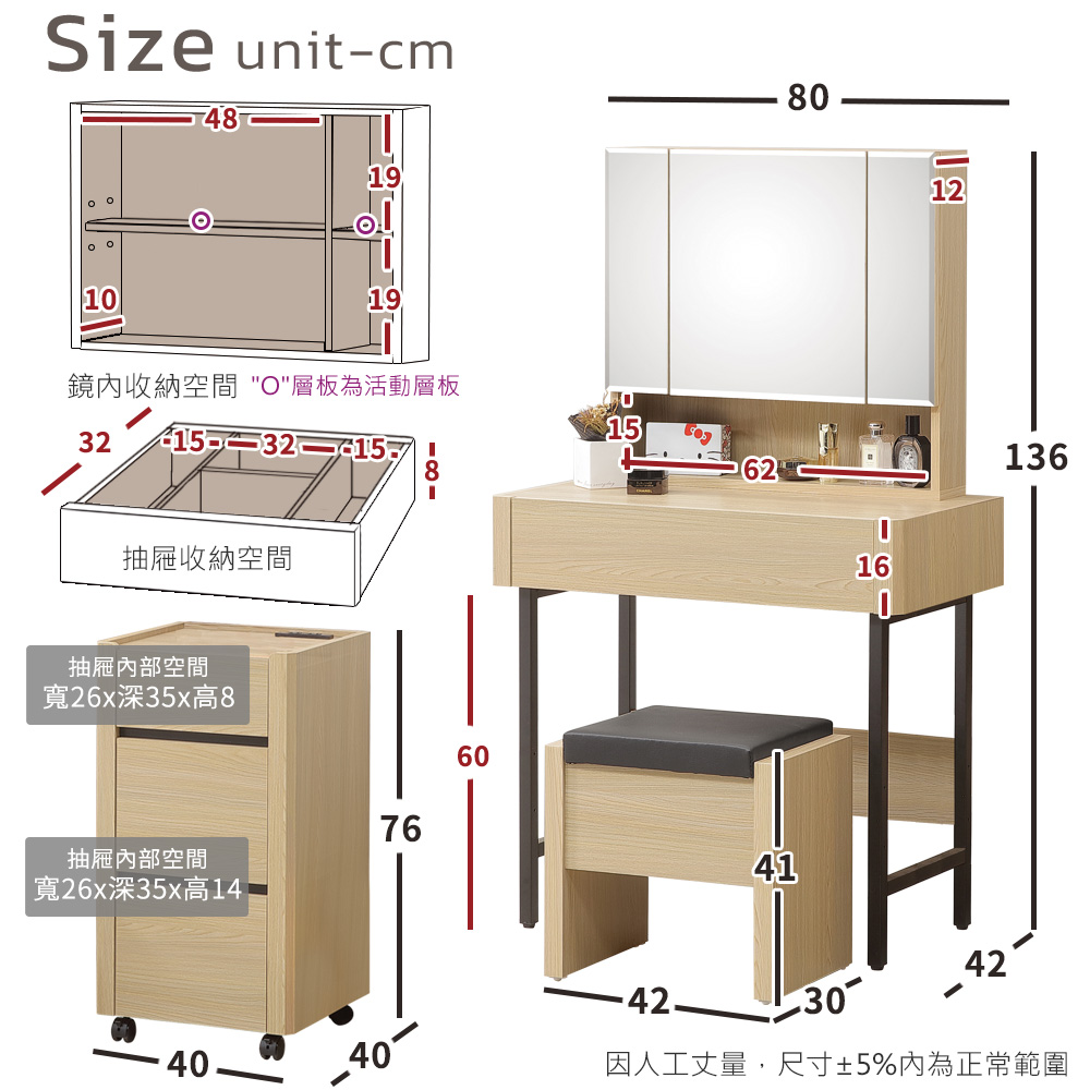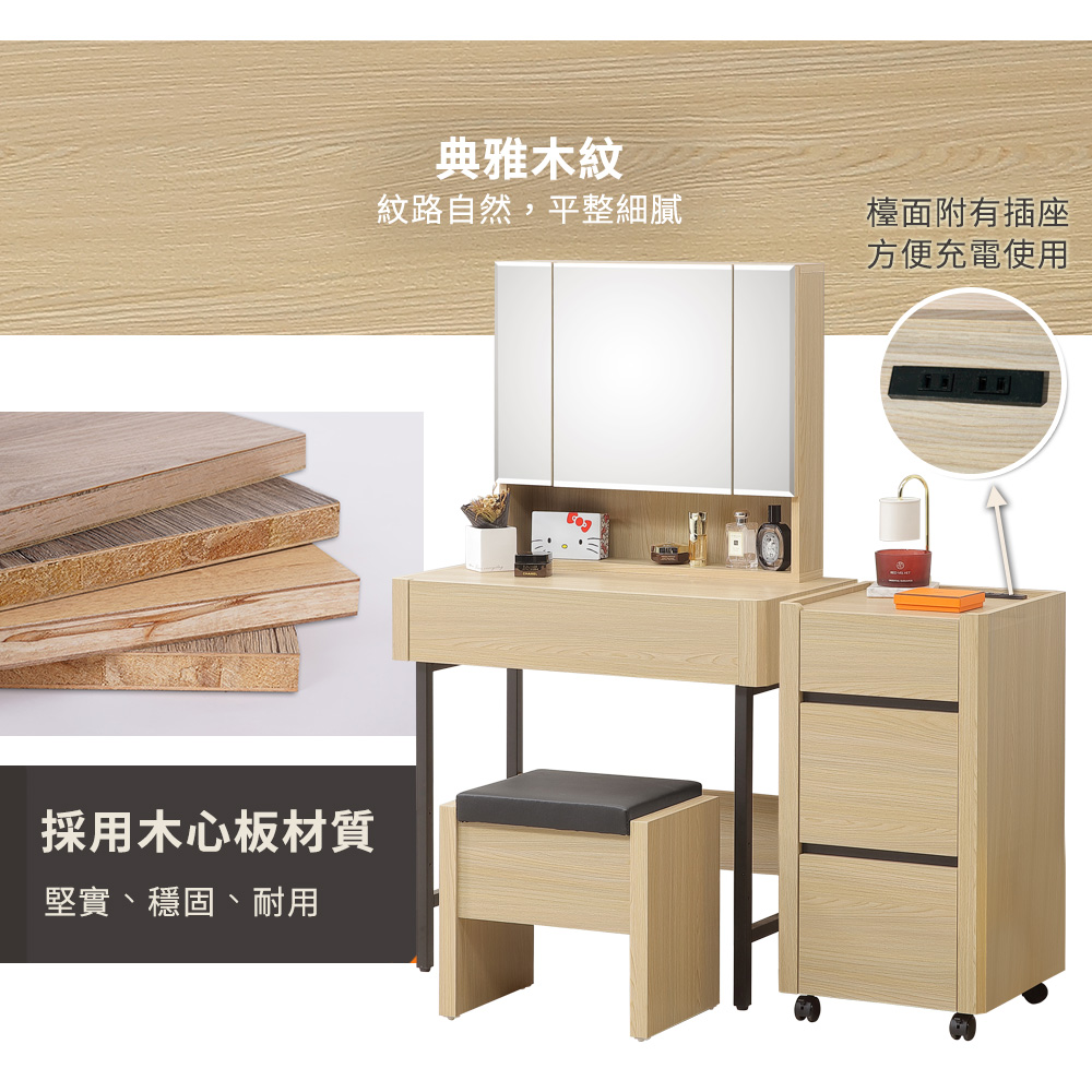 ◆木心板材質,堅實、穩固、耐用◆鋼珠滑軌,收拉更順暢◆鏡後櫃設計,輕鬆擺放小物◆化妝椅可掀可置物◆二普二煞滾輪,移動靜止都方便◆附加插座,隨時都方便好充電◆櫃緣淺槽設計預防物品滾落◆免組裝,專人配送到府整組搭配:化妝桌 x 1 + 化妝椅 x 1 + 活動櫃 x 1化妝桌尺寸:寬 80 x 深 42 x 高 136 公分化妝椅尺寸:寬 42 x 深 30 x 高 41 公分活動櫃尺寸:寬 40 x 深 40 x 高 76 公分材質:高級木心板顏色:杉木色產地:台灣誤差值: 因人工丈量,尺寸±5%內為正常範圍