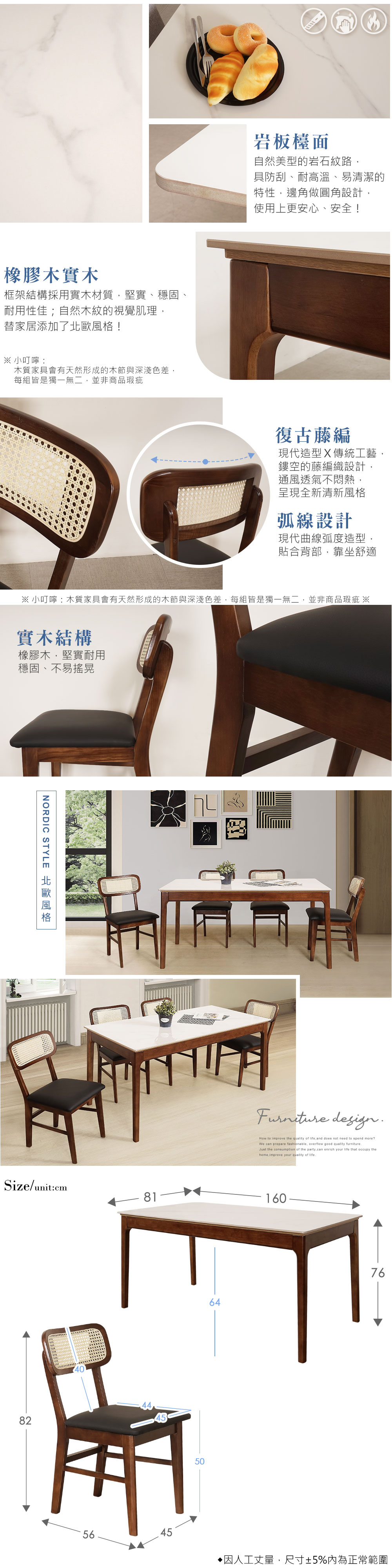 ◆大尺寸160cm的美型岩板檯面◆耐刮、耐高溫、好清潔◆實木材質結構,穩固耐用◆現代X傳統工藝,鏤空藤編風格◆貓抓皮坐墊,透氣、舒適好坐◆免自行組裝,專人配送到府整體配件:餐桌 x 1 + 餐椅 x 4餐桌尺寸:寬 160 x 深 81 x 高 76 公分餐椅尺寸:寬 45 x 深 56 x 高 82 公分餐桌材質:橡膠木、岩板、MDF餐椅材質:橡膠木、藤、貓抓皮坐墊顏色:胡桃色 產地:中國誤差值:因人工丈量,尺寸±5%內為正常範圍