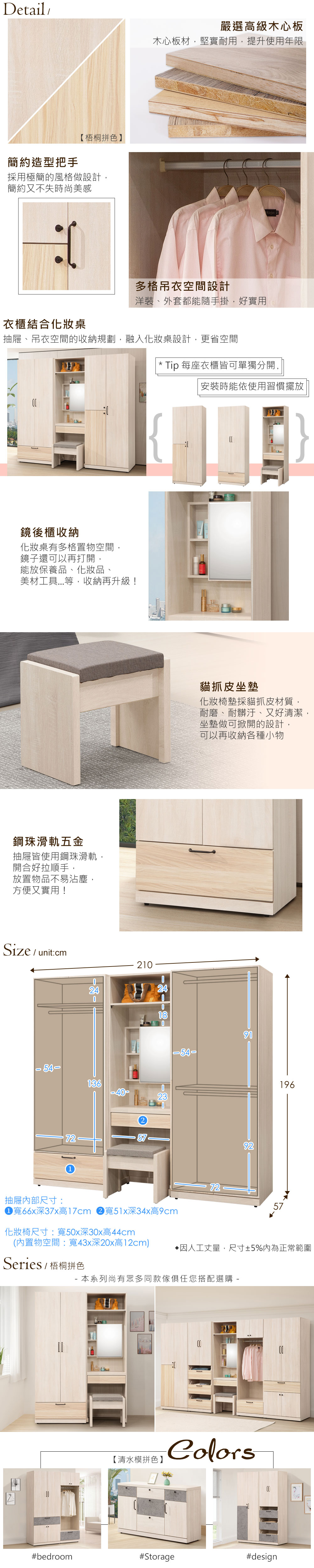 ◆質感雙拼色系,流行時尚◆三吊衣空間,實用隨手掛◆結合化妝桌椅,一次購齊◆免組裝,專人配送到府◆雪松vs.梧桐雙色調風格◆輕鬆打造如裝潢般製作手法整體尺寸:寬 210 x 深 57 x 高 196 公分化妝椅尺寸:寬 50 x 深 30 x 高 44 公分材質:高級木心板、貓抓皮座墊顏色:梧桐拼色產地:台灣誤差值:因人工丈量,尺寸±5%內為正常範圍