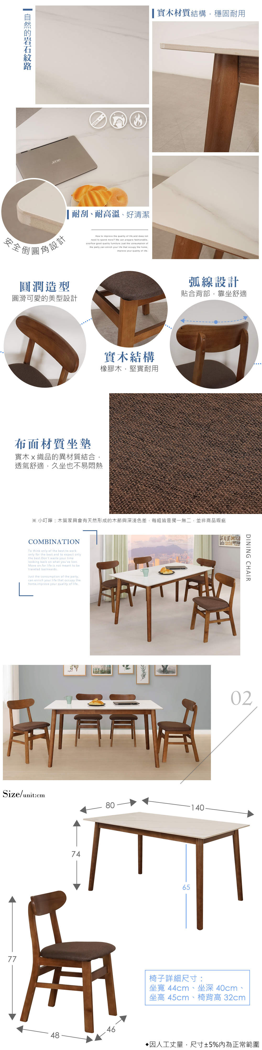 ◆岩板耐刮、耐高溫、好清潔◆實木材質結構,穩固耐用◆北歐風格設計,美型好搭◆一桌四椅,一次購齊◆免自行組裝,專人配送到府整體配件:餐桌 x 1 + 餐椅 x 4桌子尺寸:寬 140 x 深 80 x 高 74 公分椅子尺寸:寬 46 x 深 48 x 高 77 公分桌子材質:橡膠木、岩板椅子材質:橡膠木、布面顏色:胡桃色產地:中國誤差值:因人工丈量,尺寸±5%內為正常範圍
