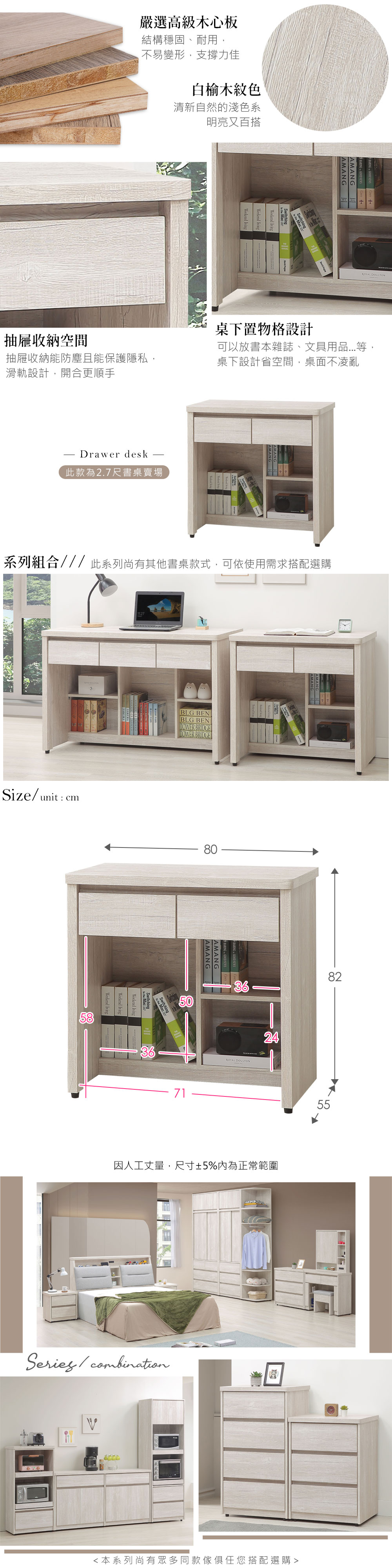 ◆木心板材質,堅實、穩固、耐用◆清新淺色系,質感木紋路視覺◆抽屜設計,分類物品、收納防塵◆桌下開放置物格,增加收納空間◆免組裝,由專人宅配到府尺寸:寬 80 x 深 55 x 高 82 公分材質:高級木心板顏色:白榆木色產地:台灣誤差值:因人工丈量,尺寸±5%內為正常範圍